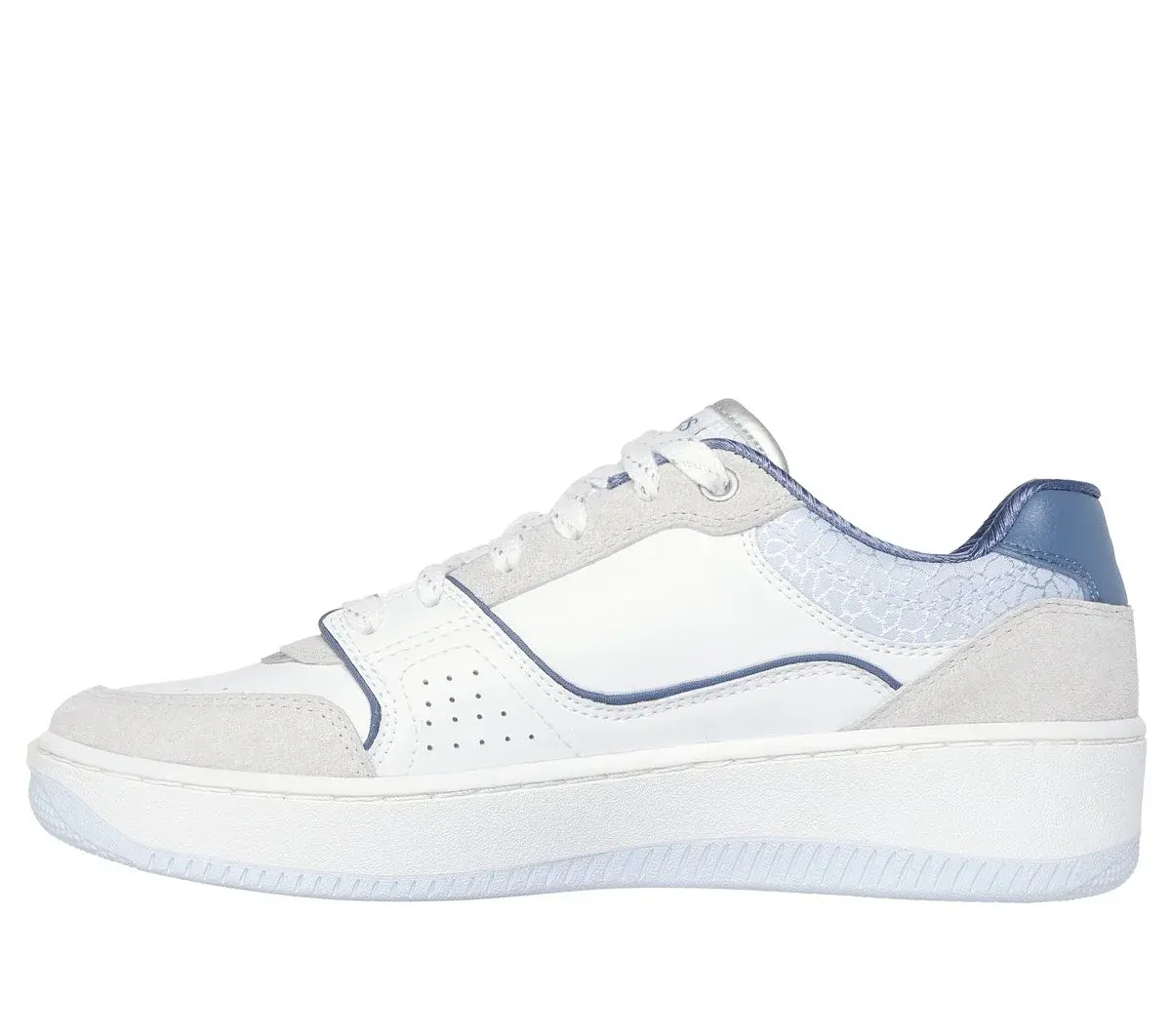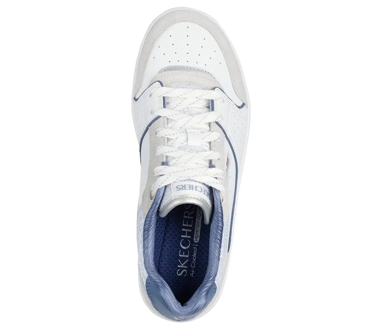 Casual modern style and comfort combine in Skechers Sport Court 2.0 – Metallic Break. Featuring a sleek court silhouette, this lace-up boasts a duraleather and pig suede upper with metallic trim, complemented by a cushioned Skechers Air-Cooled Memory Foam® insole.