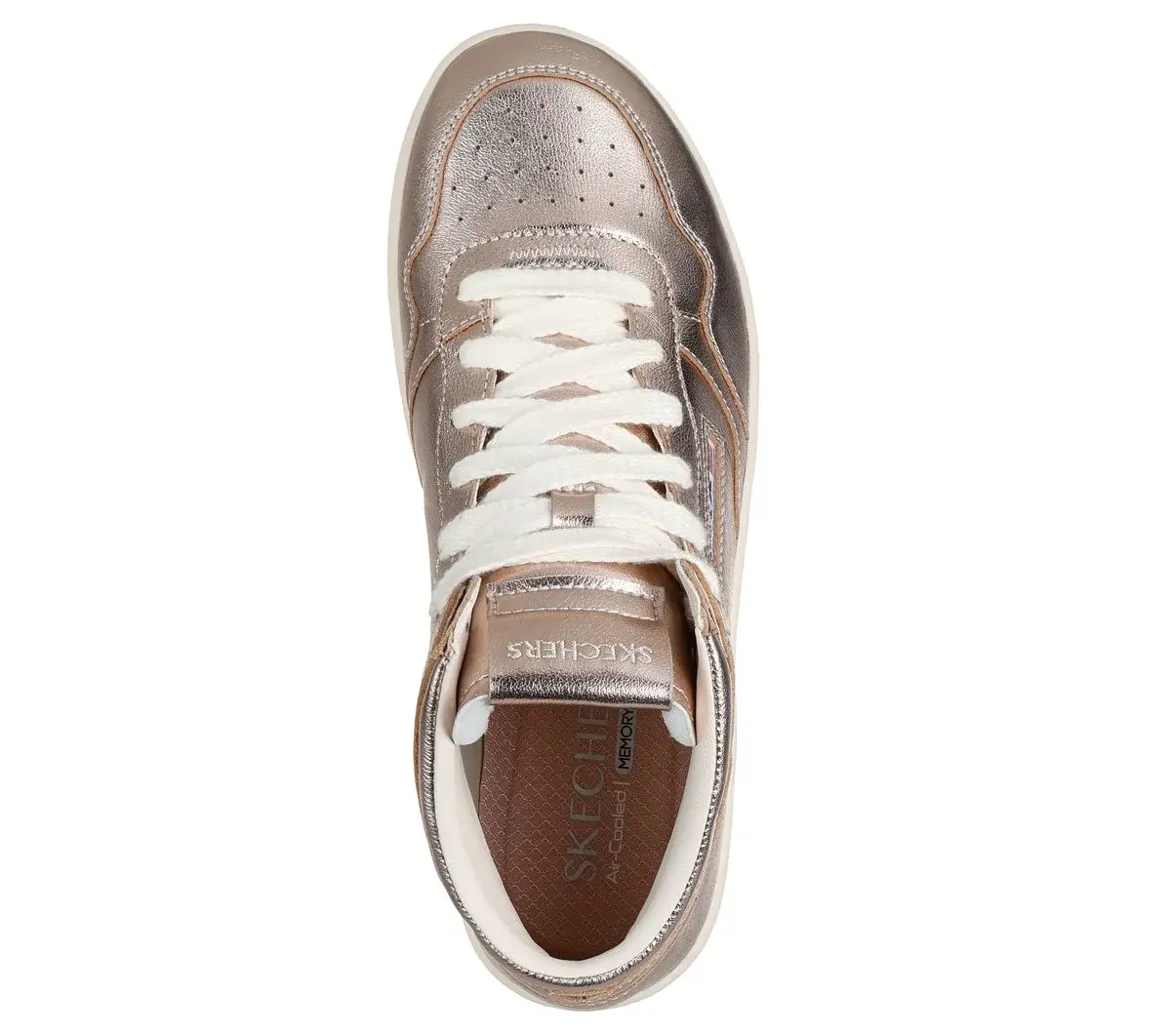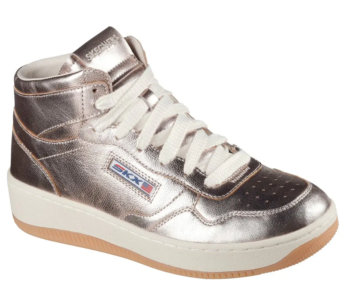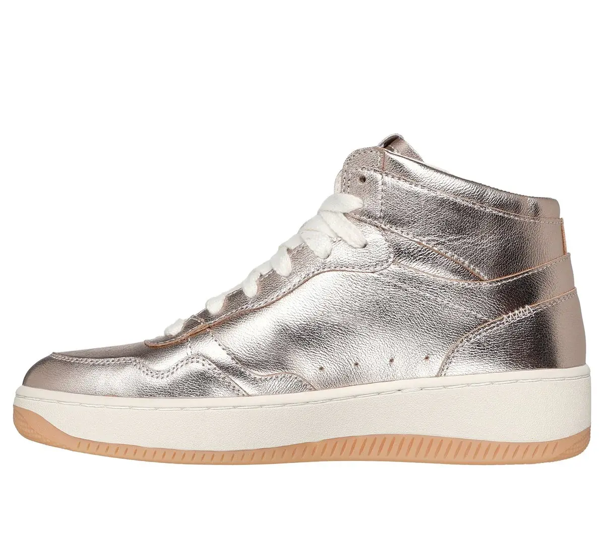 Fun retro style and comfort combine in Skechers Sport Court 2.0 – Shining Glory. This court-style high-top lace-up features a leather upper in a metallic finish, complemented by a cushioned Skechers Air-Cooled Memory Foam® insole.