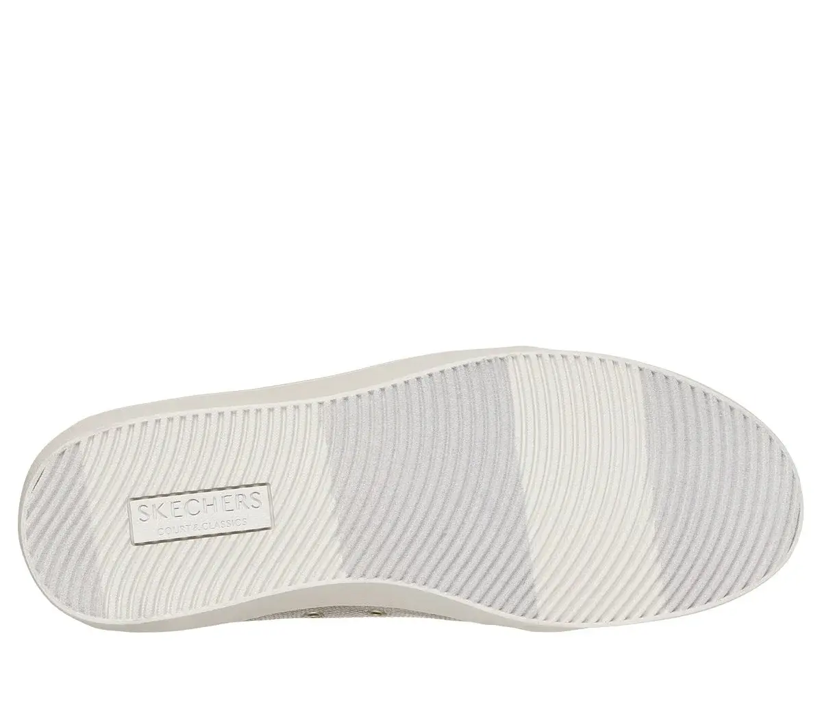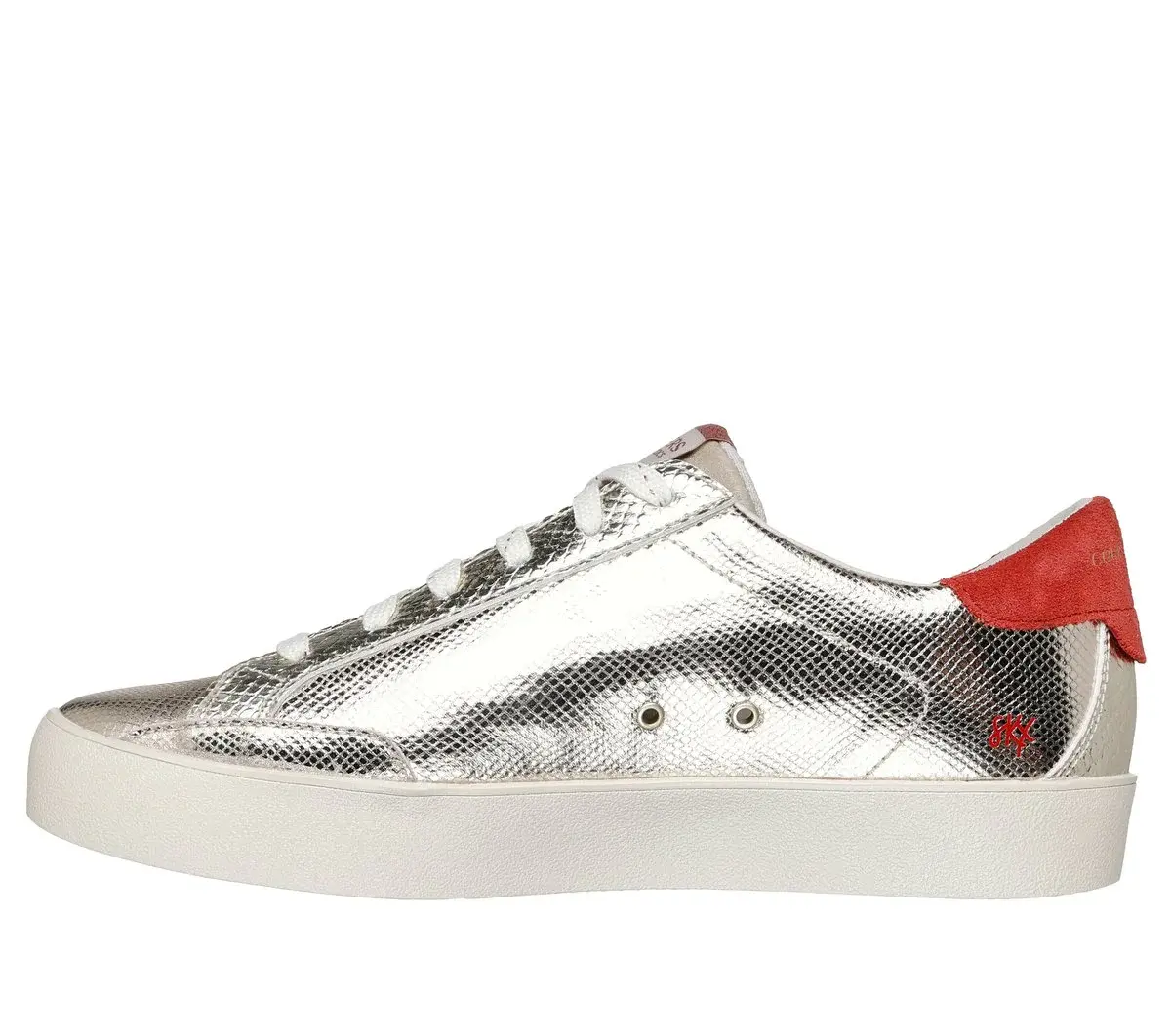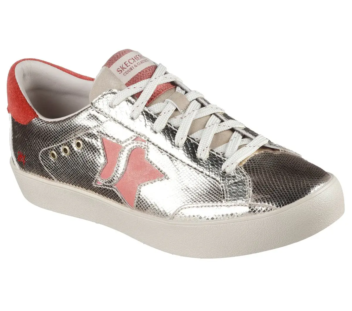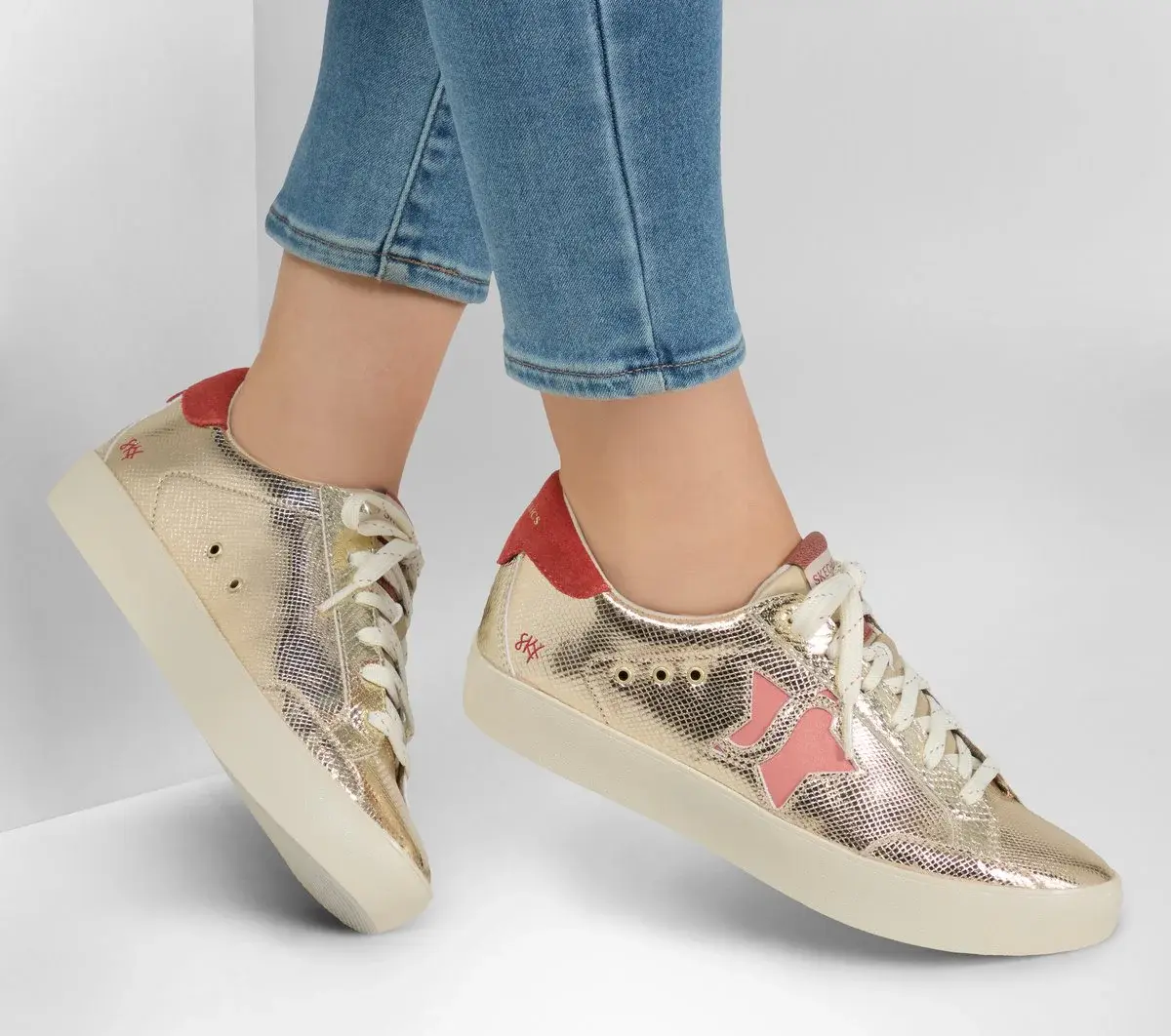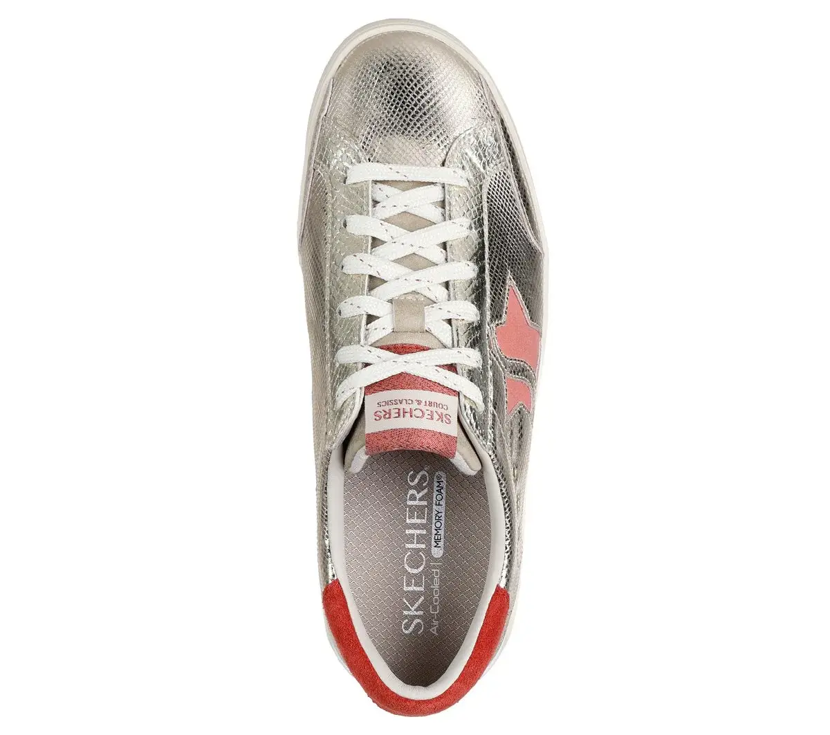 Find your star power style with uncompromising comfort wearing Skechers Strand Star – Glimmer Chic. This low-top fashion lace-up features a metallic duraleather upper with a Skechers Air-Cooled Memory Foam® cushioned insole and court-style midsole with hidden heel wedge.