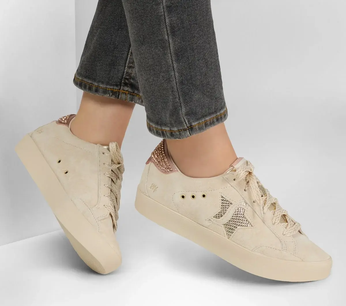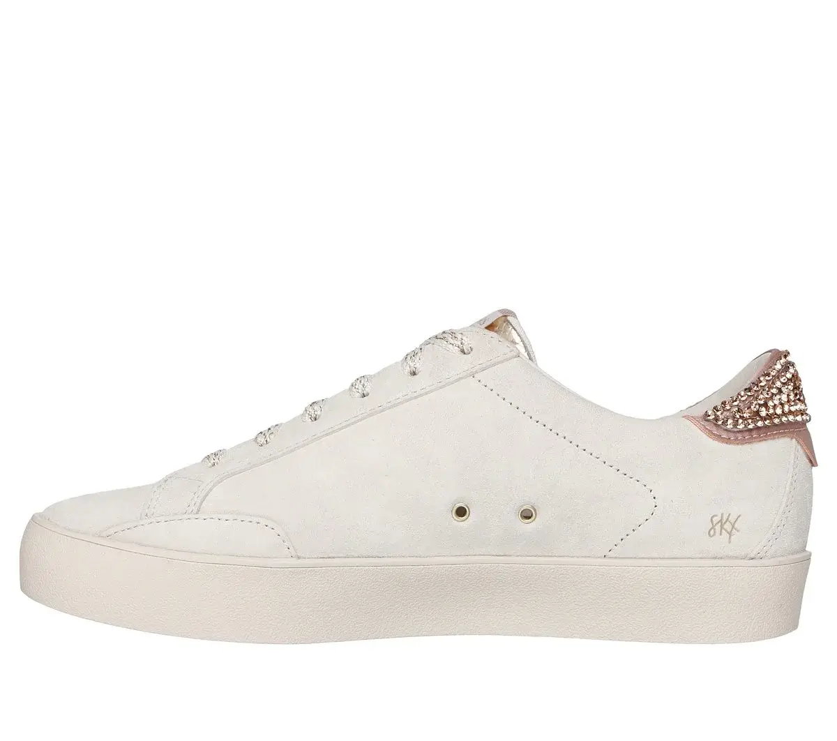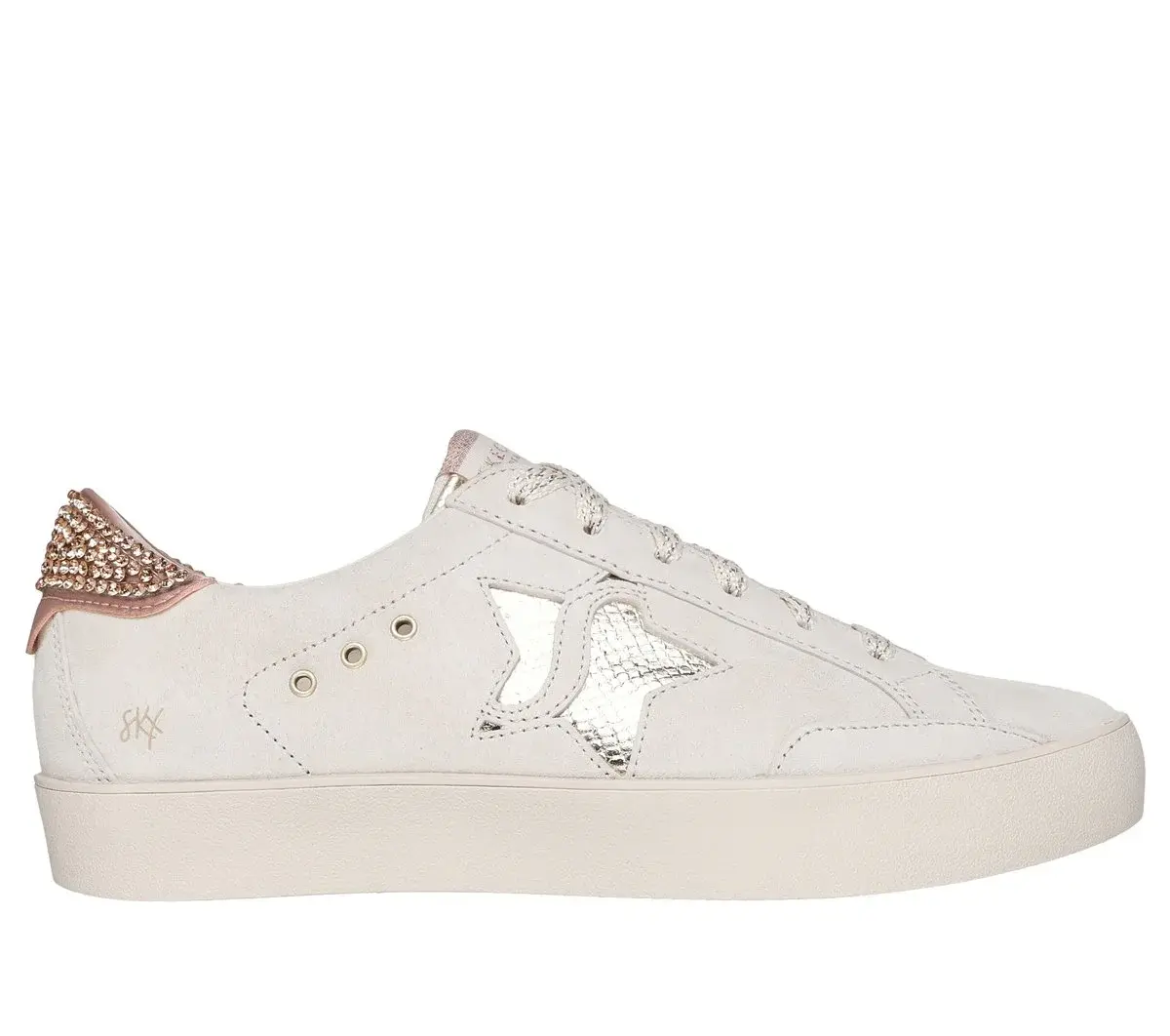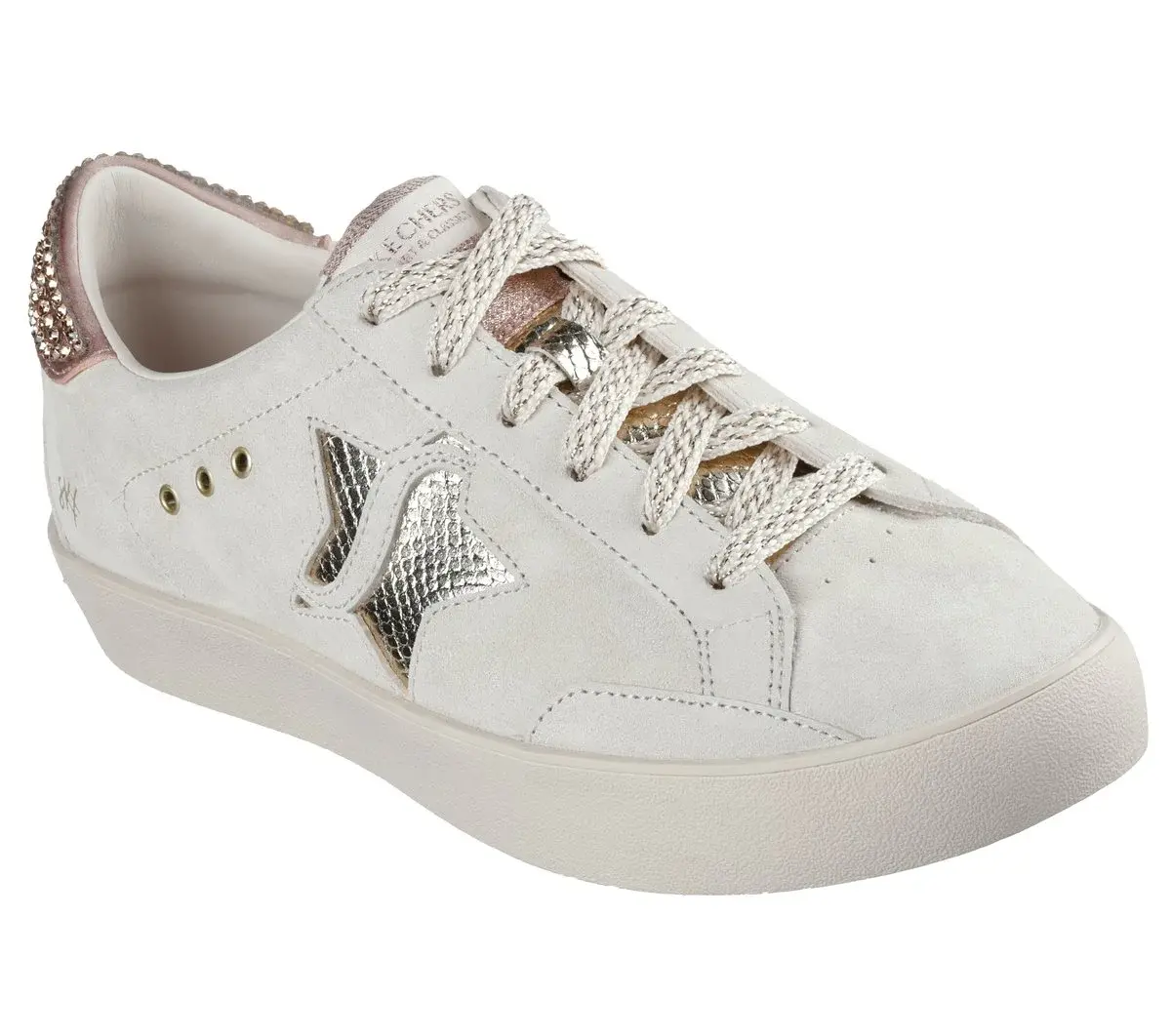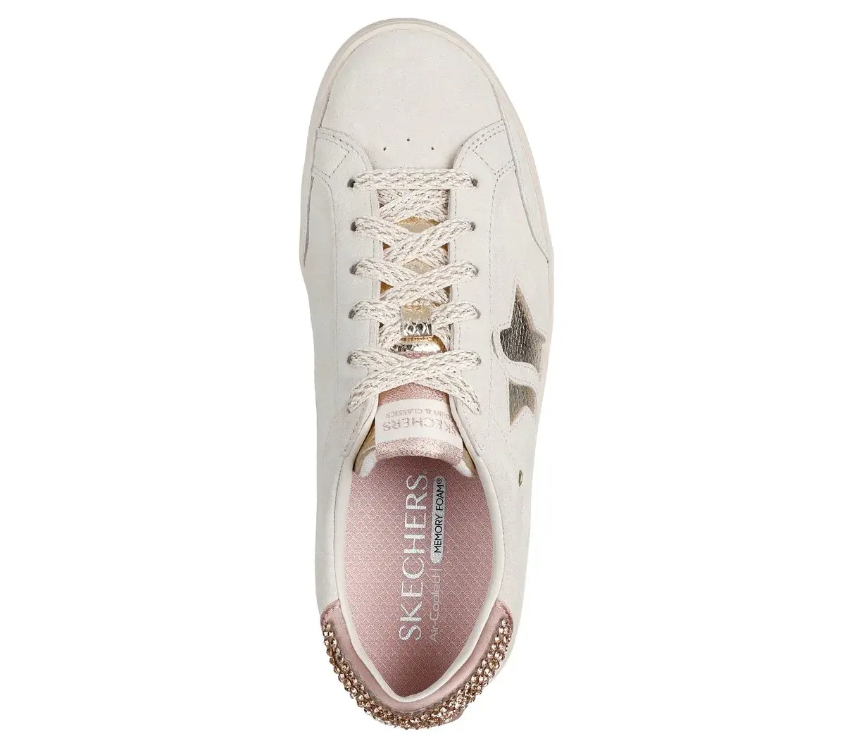 Find your star power style with uncompromising comfort wearing Skechers Strand Star – Leading Star. This low-top fashion lace-up features a suede upper with a metallic duraleather star detail, a Skechers Air-Cooled Memory Foam® cushioned insole, and court-style midsole with hidden heel wedge.