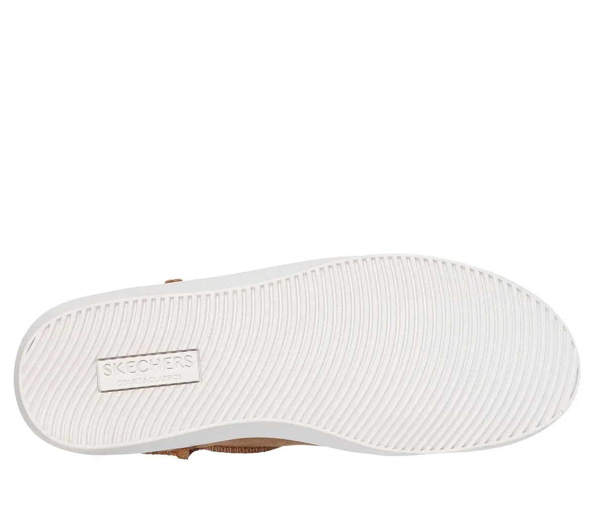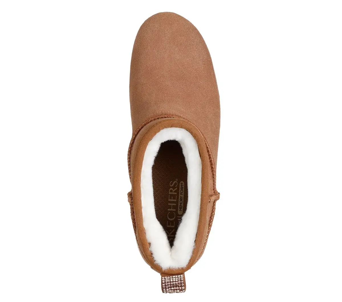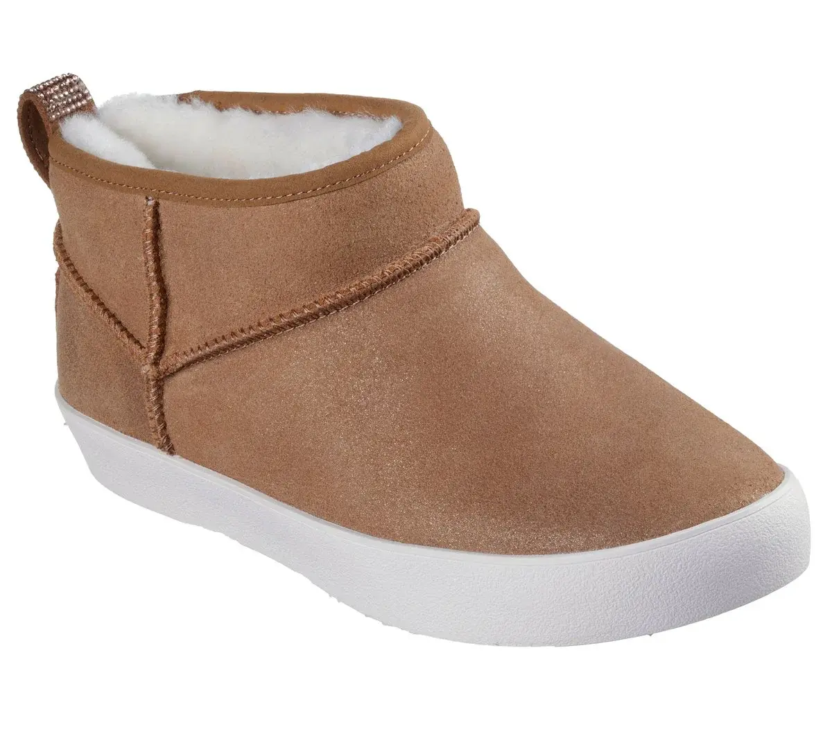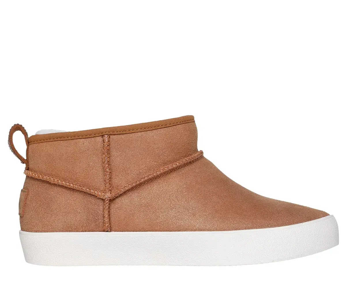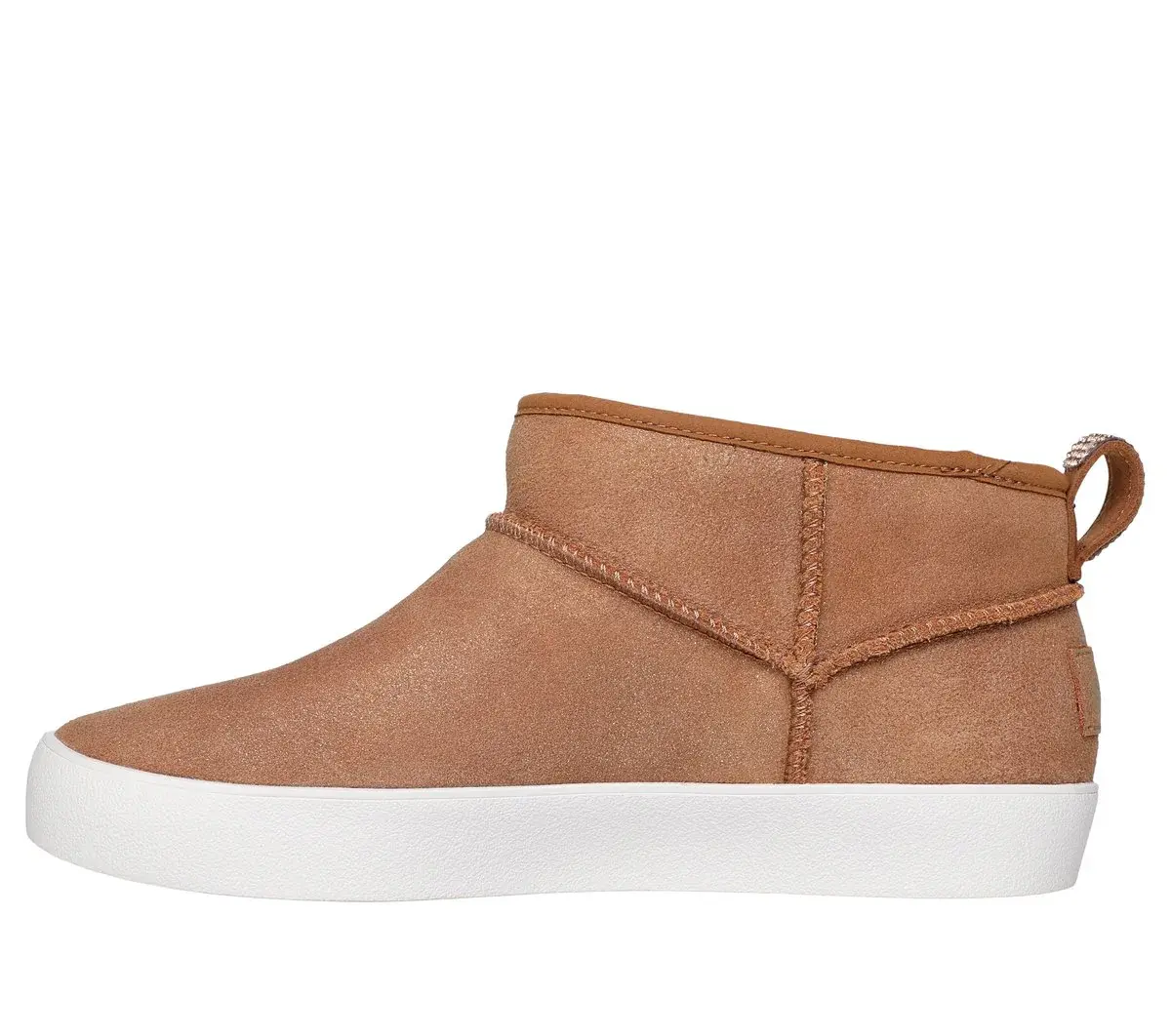 Find your star power style with uncompromising comfort wearing Skechers Strand Star – Warm Shimmer. This fashion sneaker bootie features a pull-on metallic suede upper, a hidden wedge court-style midsole, and a Skechers Air-Cooled Memory Foam® cushioned insole.