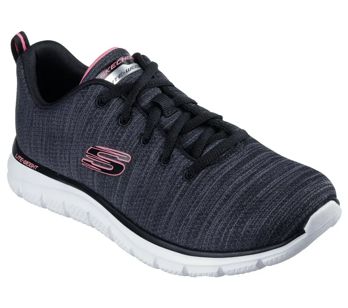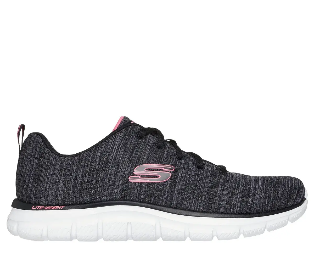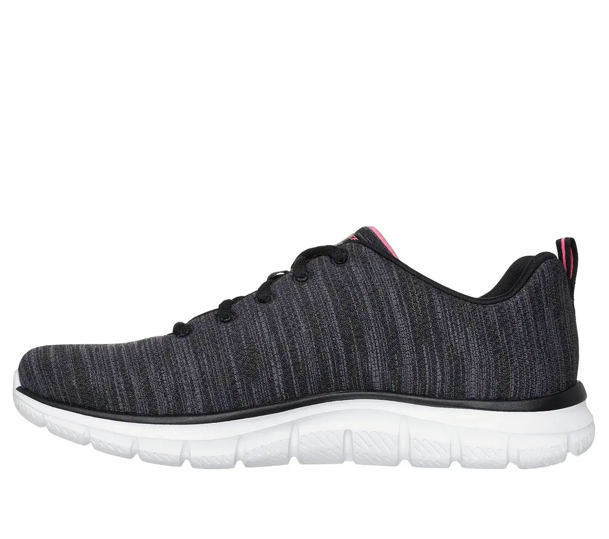 Train in lightweight comfort and sporty style wearing Skechers Track – Soft Stride. This sleek vegan design features a heathered jersey upper with color pop details, a lace-up front, and a cushioned Skechers Memory Foam™ comfort insole.