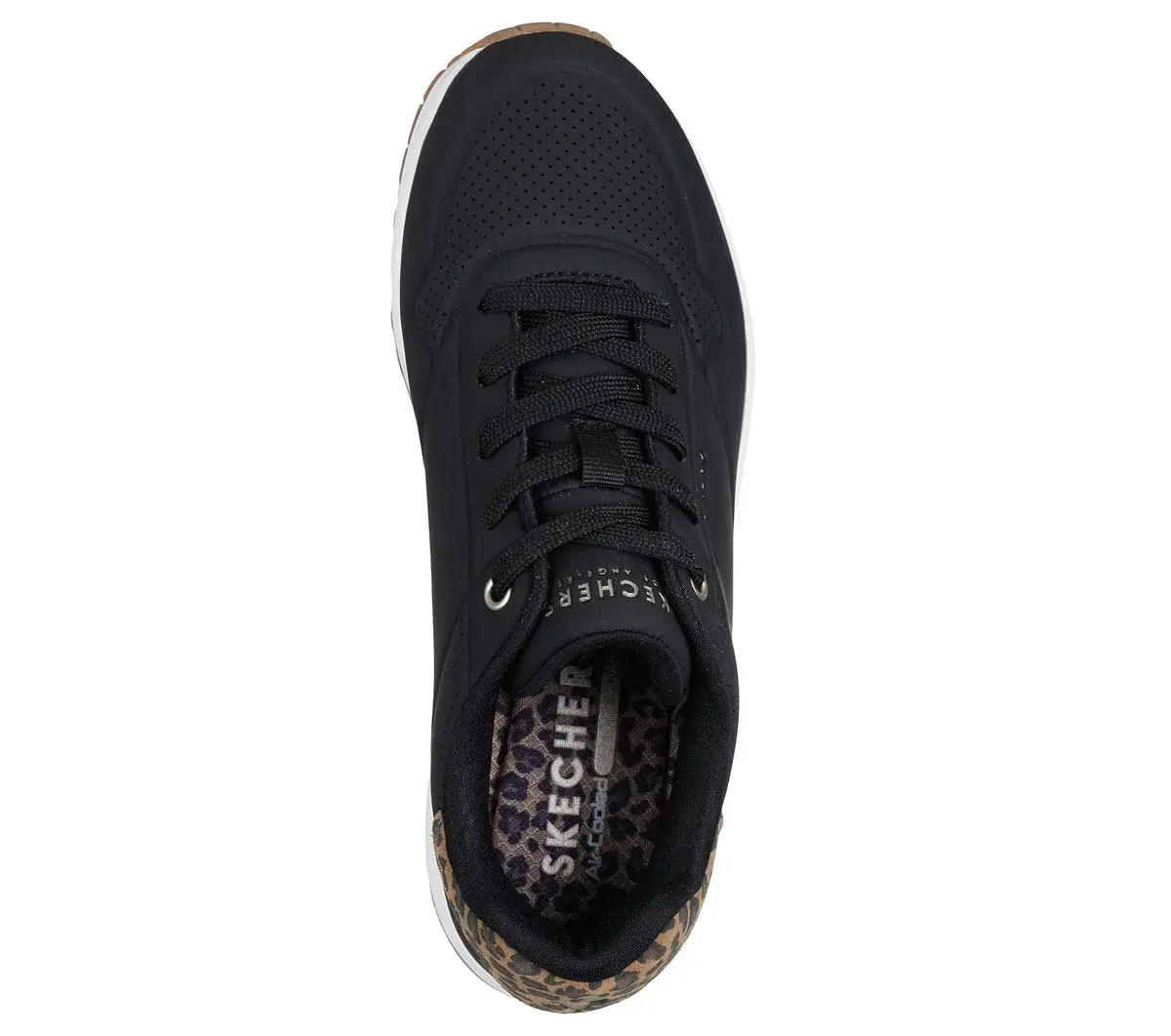 Walk on air in the wildly comfortable Skechers Street™ Uno – Jungle Nite. This lace-up fashion sneaker features a synthetic upper with leopard print heel mustache, a Skechers Air-Cooled Memory Foam® insole, and a Skech-Air® visible air-cushioned midsole.
