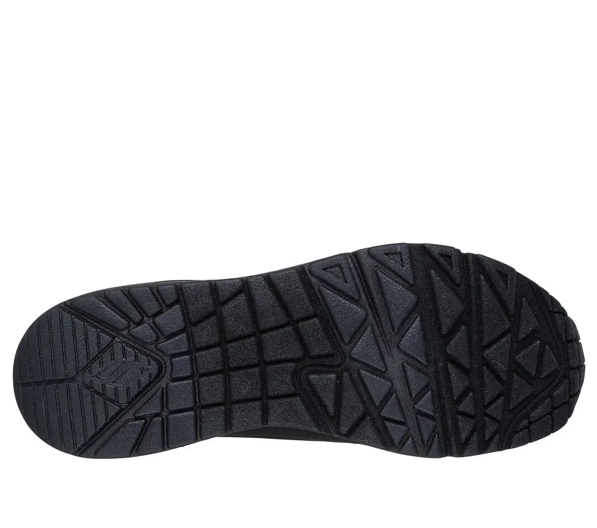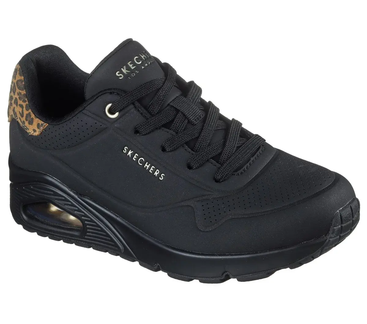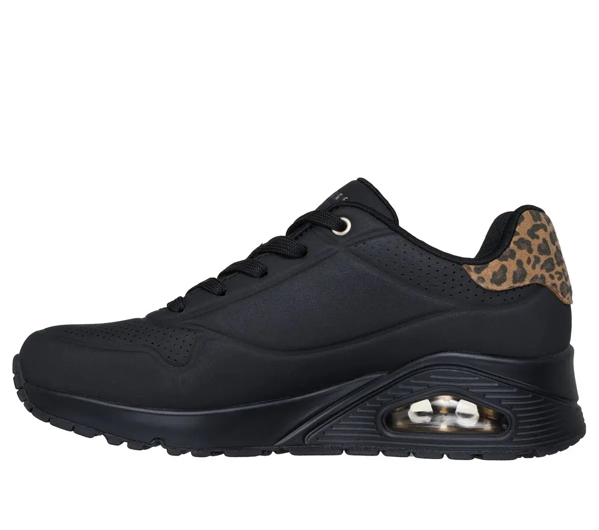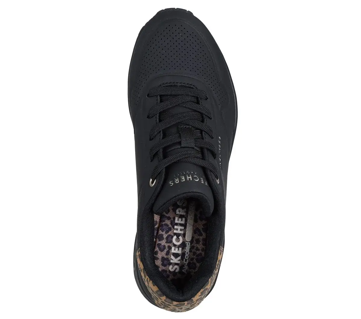 Walk on air in the wildly comfortable Skechers Street™ Uno – Jungle Nite. This lace-up fashion sneaker features a synthetic upper with leopard print heel mustache, a Skechers Air-Cooled Memory Foam® insole, and a Skech-Air® visible air-cushioned midsole.