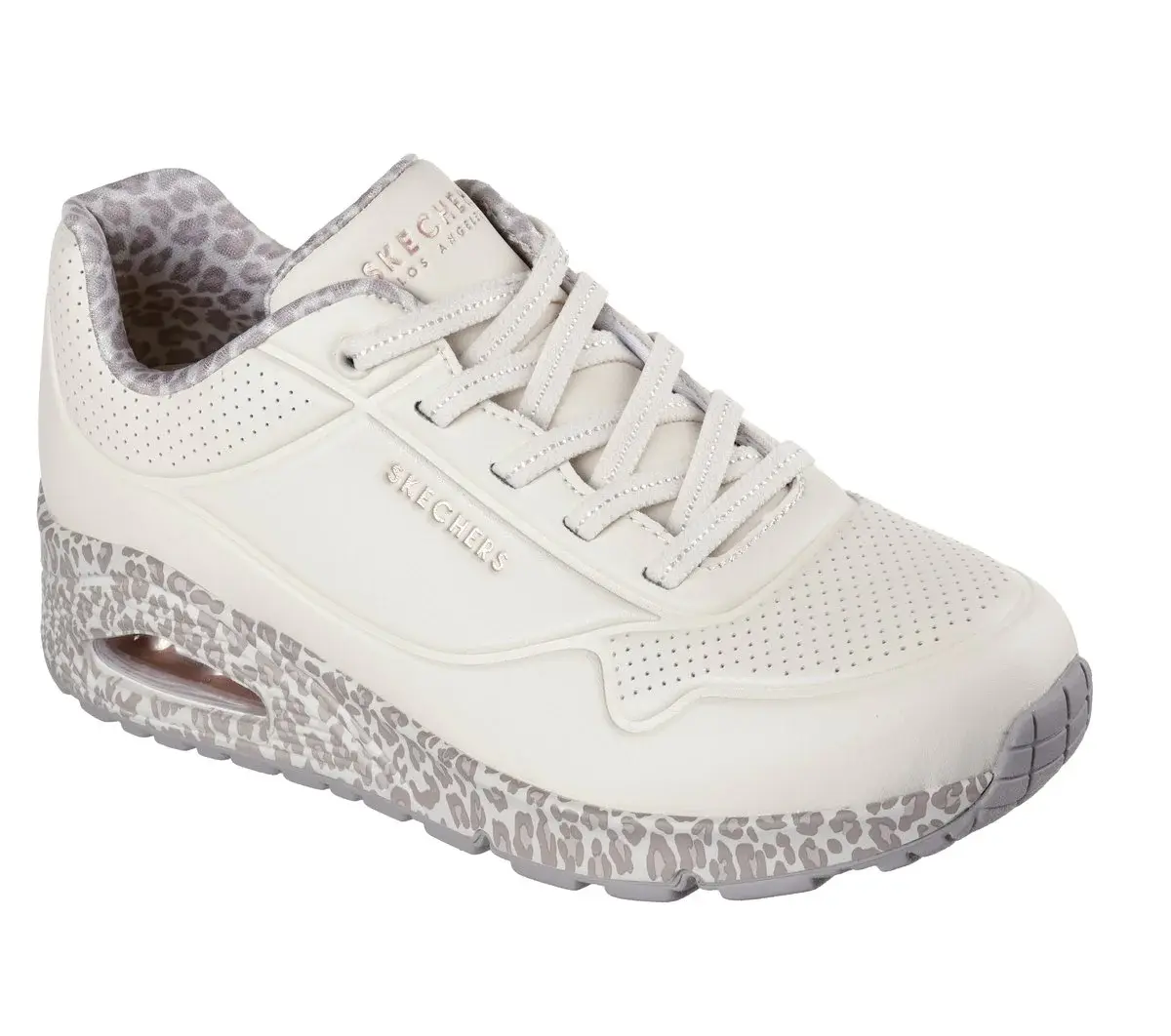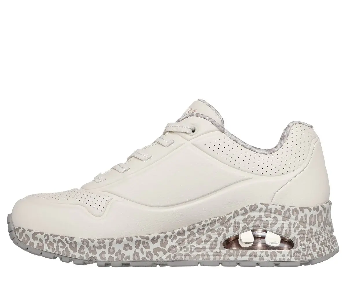 Walk on air in the wildly comfortable Skechers Street™ Uno – Safari Time. This stretch-laced fashion sneaker features a duraleather upper with a leopard print lining and midsole, a Skechers Air-Cooled Memory Foam® insole, and a Skech-Air® visible air-cushioned midsole.