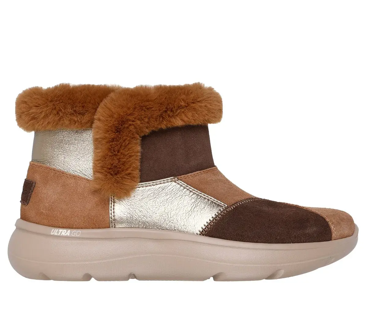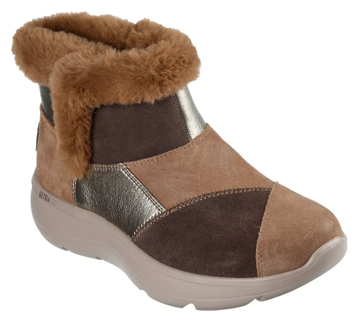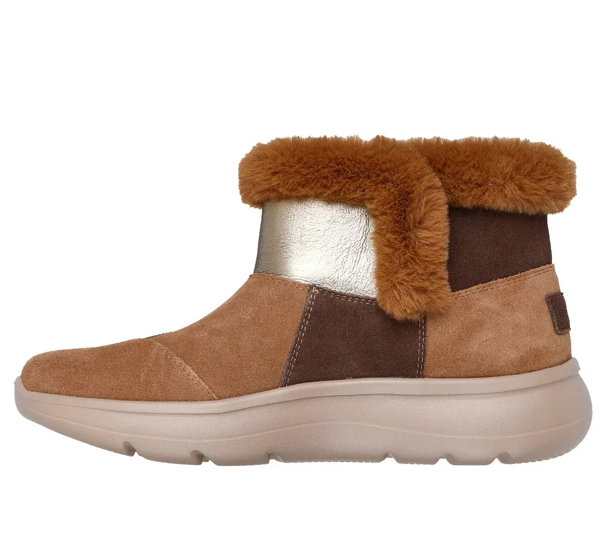 Stay warm and cozy all season wearing Skechers On-the-GO® Encore – Caitlin. This pull-on ankle bootie features a 3M® Scotchgard® treated leather patchwork upper with a plush faux-fur collar, Skechers Air-Cooled Goga Mat™ insole, and an ULTRA GO® cushioned midsole.