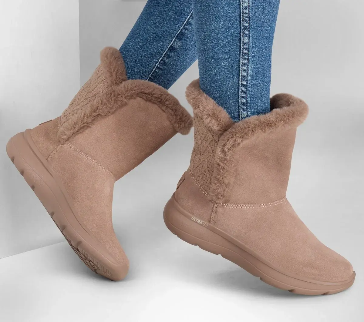 Stay warm and cozy all season wearing Skechers On-the-GO® Encore – Snow Flurry. This pull-on boot features a 3M® Scotchgard® treated suede upper with a sweater knit and faux-fur trim, Skechers Air-Cooled Goga Mat™ insole, and an ULTRA GO® cushioned midsole.