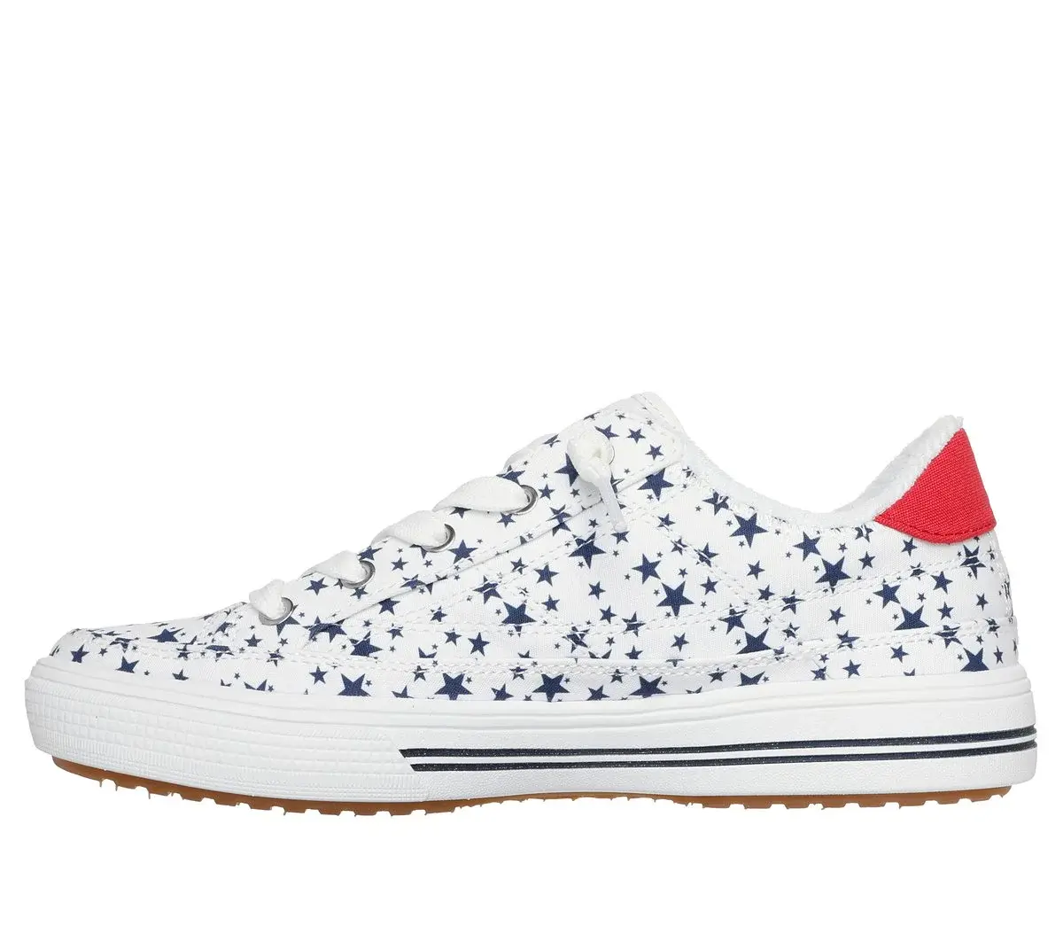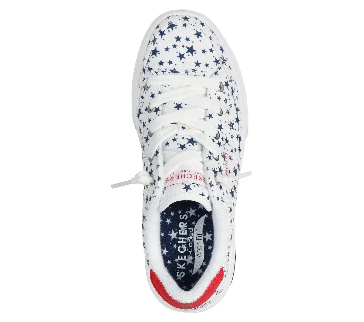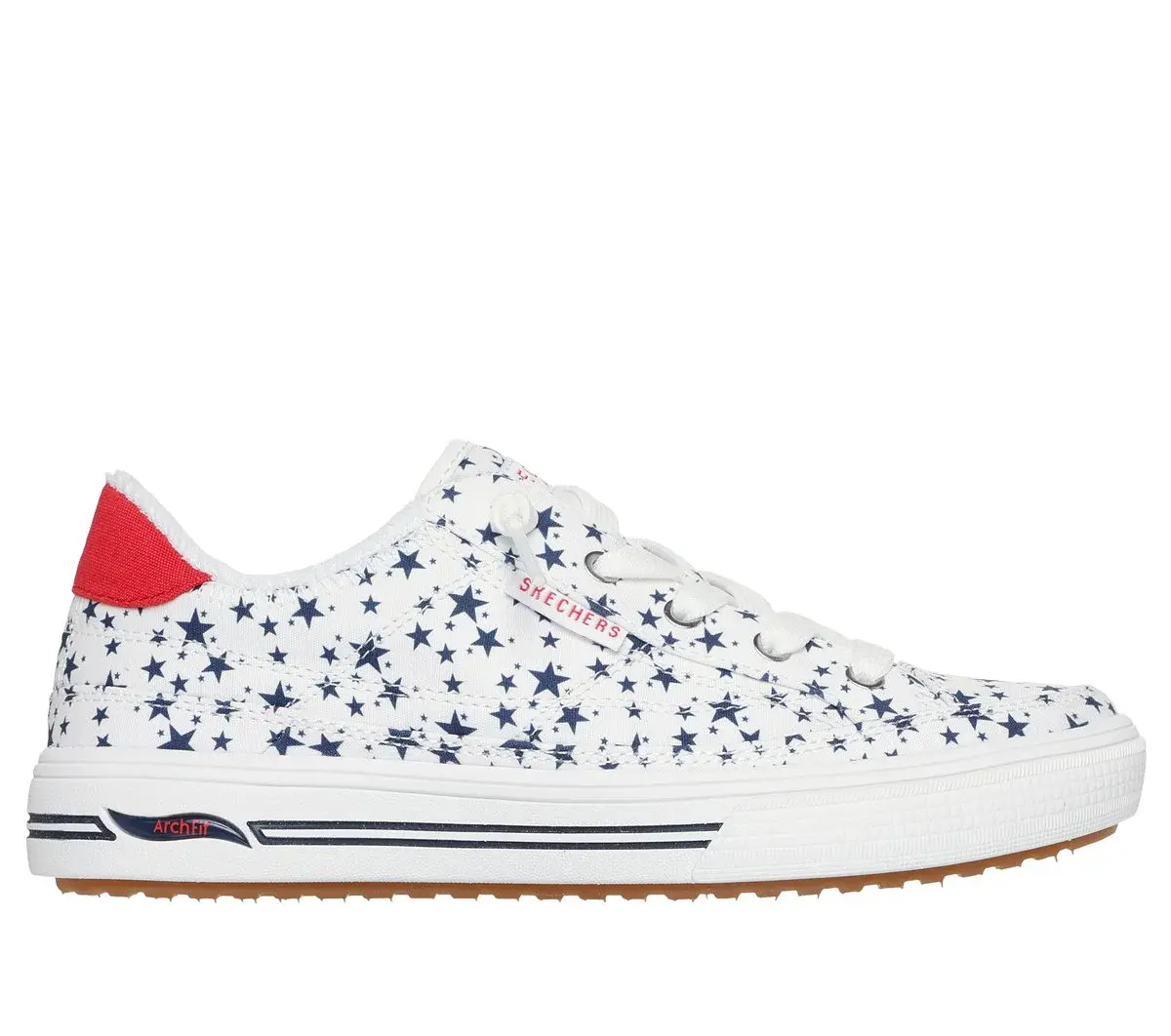 Put some pride in your stride with Skechers Street™ Arch Fit® Arcade – Born Free. This star-spangled vegan style has been granted the APMA Seal of Acceptance and features a printed canvas upper with tied-off deco laces and a removable Arch Fit® insole.