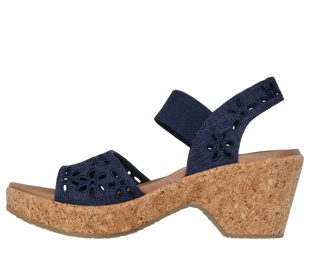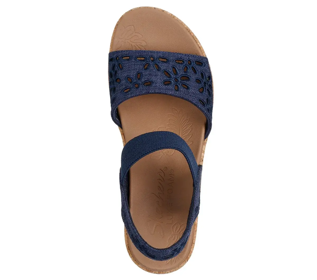 Diamond style comfort and looks combine in Skechers Cali® Brystol – Beach Bliss. This strappy wedge sandal features a canvas floral eyelet upper with a pull-on gore strap, and a cushioned Luxe Foam® footbed.