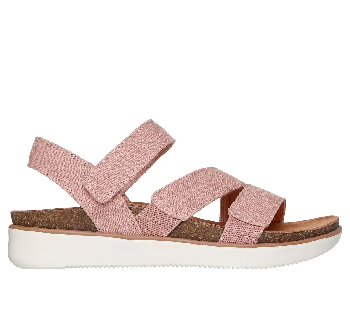 Bring sensibly modern design to your warm weather look wearing Skechers Lifted Comfort – Dreamy Eyes. This slingback vegan sandal features a sparkly canvas upper with an adjustable hook-and-loop closure and a cushioned comfort footbed with cork trim.