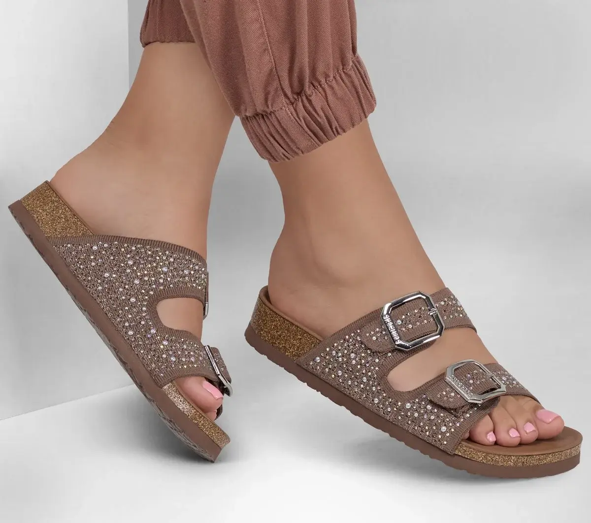 Dazzle your way through the day in laid-back comfort wearing Skechers Arch Fit® Granola – Casually Stunning. This vegan double band slide sandal has been granted the APMA Seal of Acceptance and features a rhinestone knit upper and a supportive Arch Fit® footbed with Luxe Foam® cushioning.