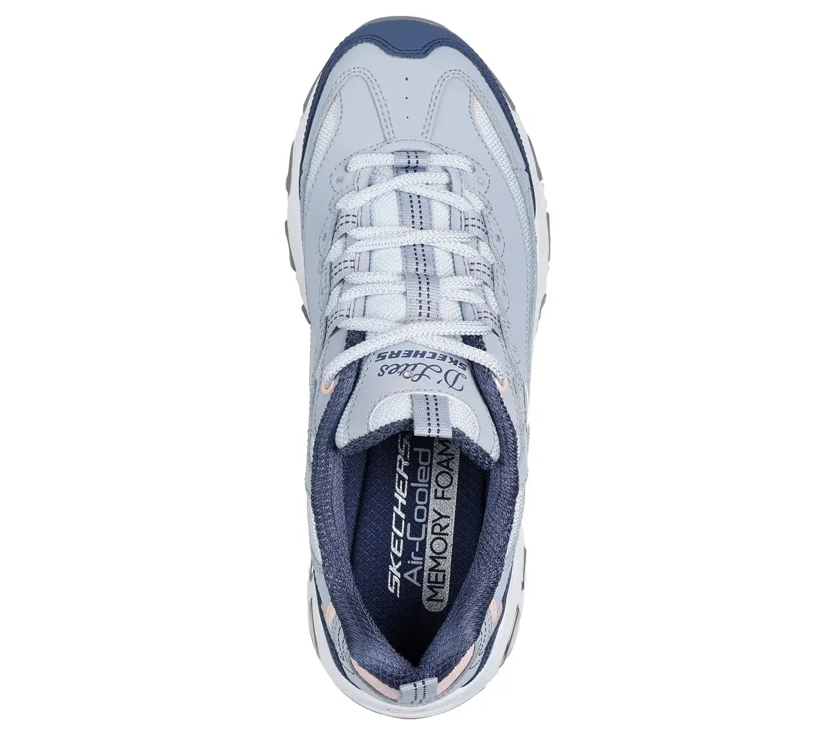 Trending style and comfort combine in the iconic classic Skechers D’Lites® – Popular Vote. This lace-up fashion style features a leather and mesh upper with synthetic trim and a cushioned Air-Cooled Memory Foam® insole.