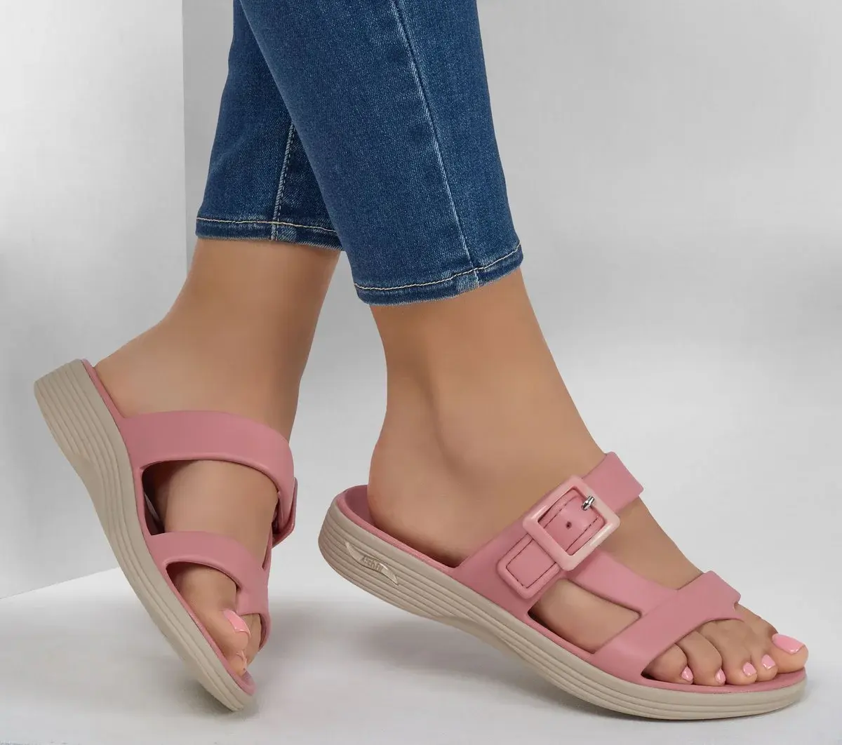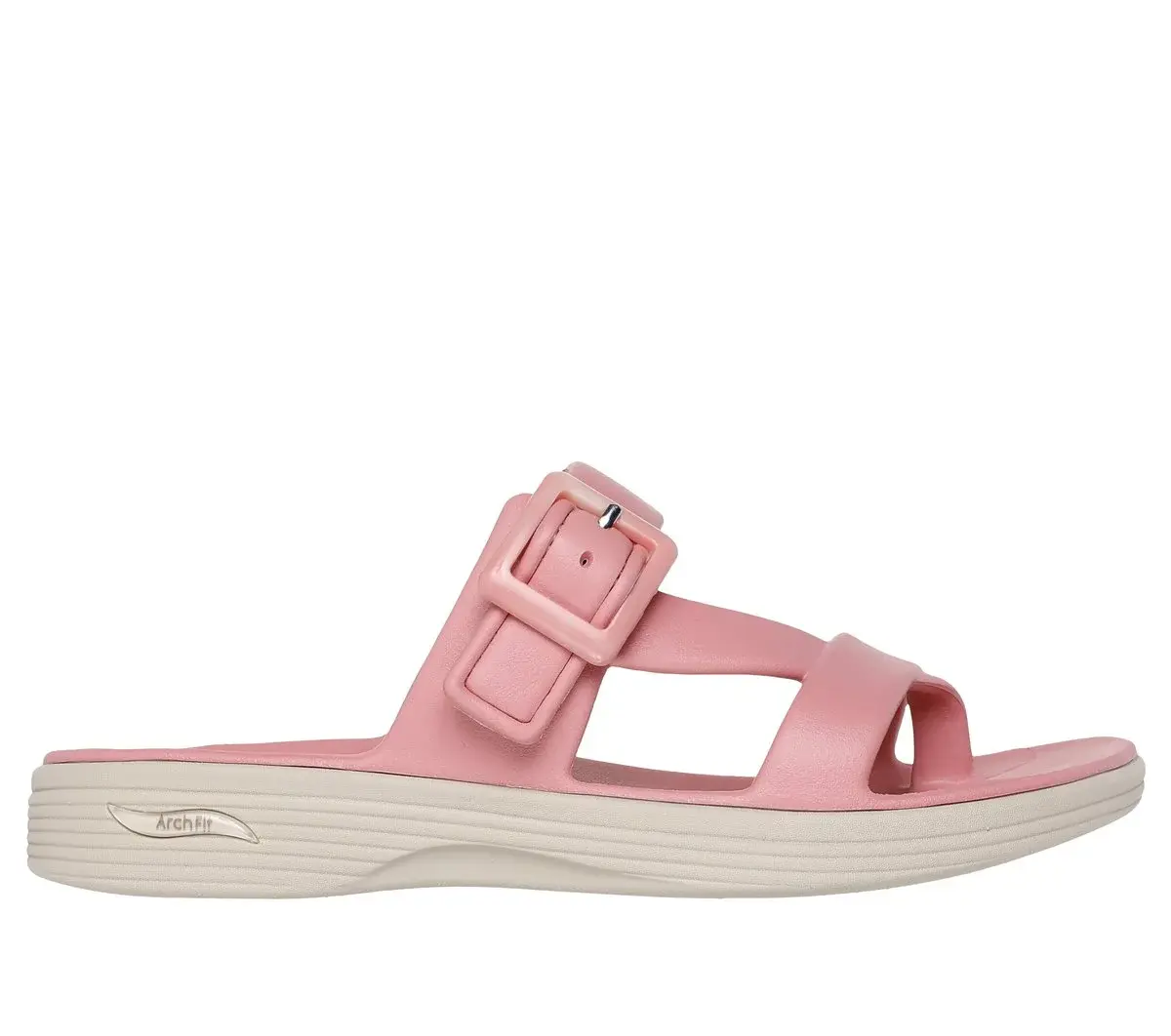 Summery style combines with long-lasting comfort in Skechers Foamies®: Arch Fit® Maui – Seaside. This slide sandal features a Foamies® sculpted lightweight EVA upper, buckle detail, toe loop, and a supportive Arch Fit® footbed.