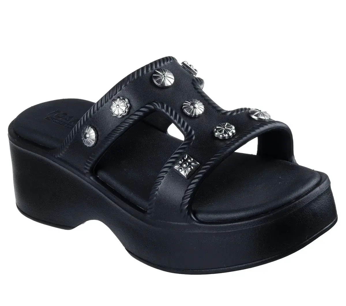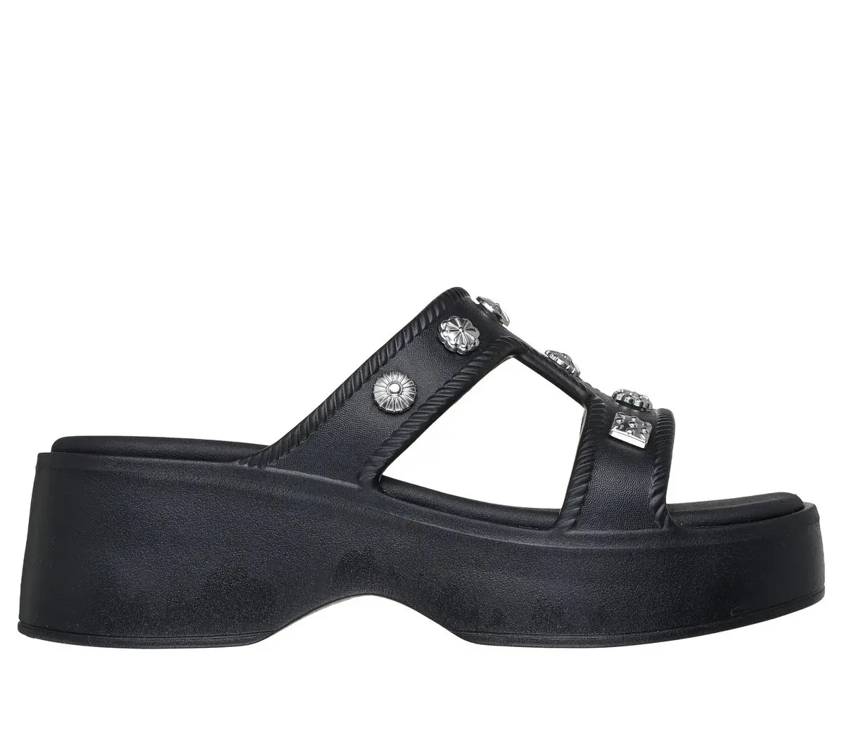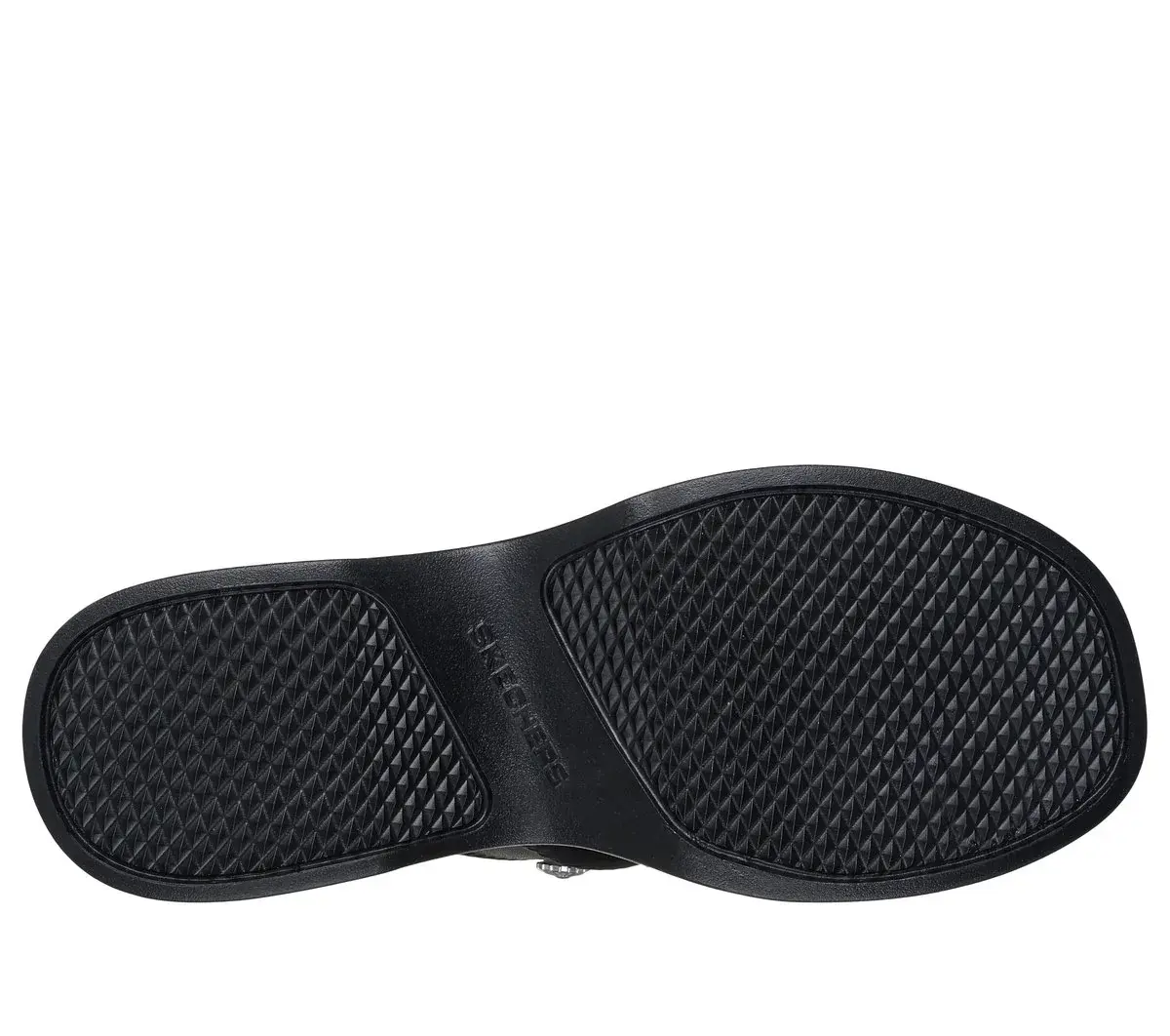 Get a fashion-worthy boost wearing Skechers Foamies®: Rave – It-Girl. This sculpted T-strap fashion slide sandal features a flexible Foamies® EVA upper with a cushioned footbed, deco metallic bits, and a platform midsole.