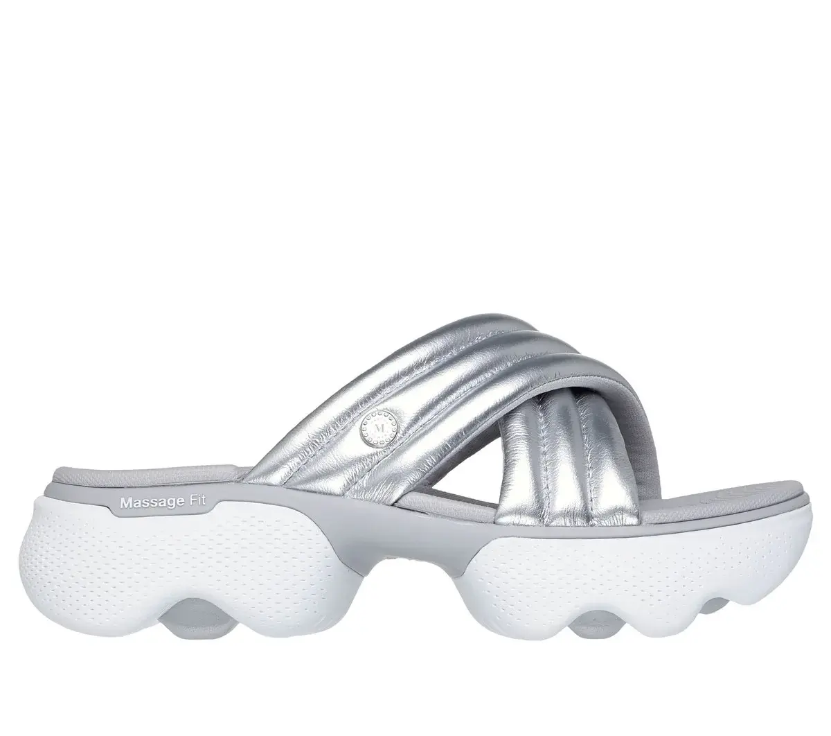Celebrated lifestyle expert, Martha Stewart, delivers her one-of-a-kind touch to Skechers in this spirited collaboration. Ease back in standout style and summery comfort with Martha Stewart x Skechers: Massage Fit Edge – Shine Bright. This vegan slide sandal features a quilted puffy upper with a metallic finish and a contoured Goga Mat® footbed with Arch Comfort® for added support.
