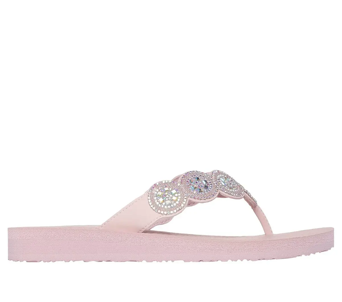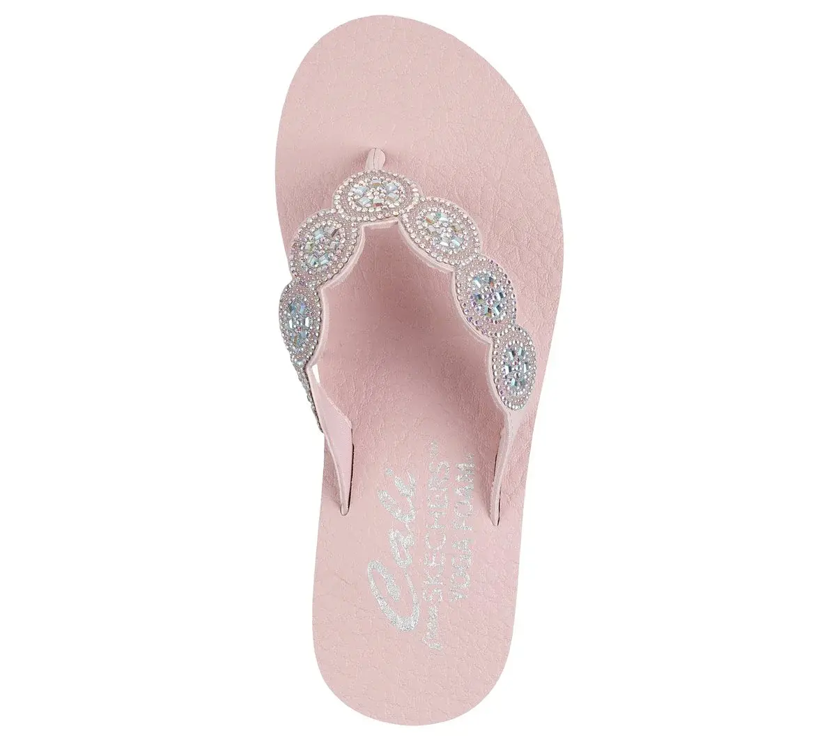 Glam up in style this season wearing Skechers Cali® Meditation – Alluring Image. This casual vegan thong sandal features a synthetic upper with rhinestone embellishments and a cushioned Yoga Foam® comfort footbed.
