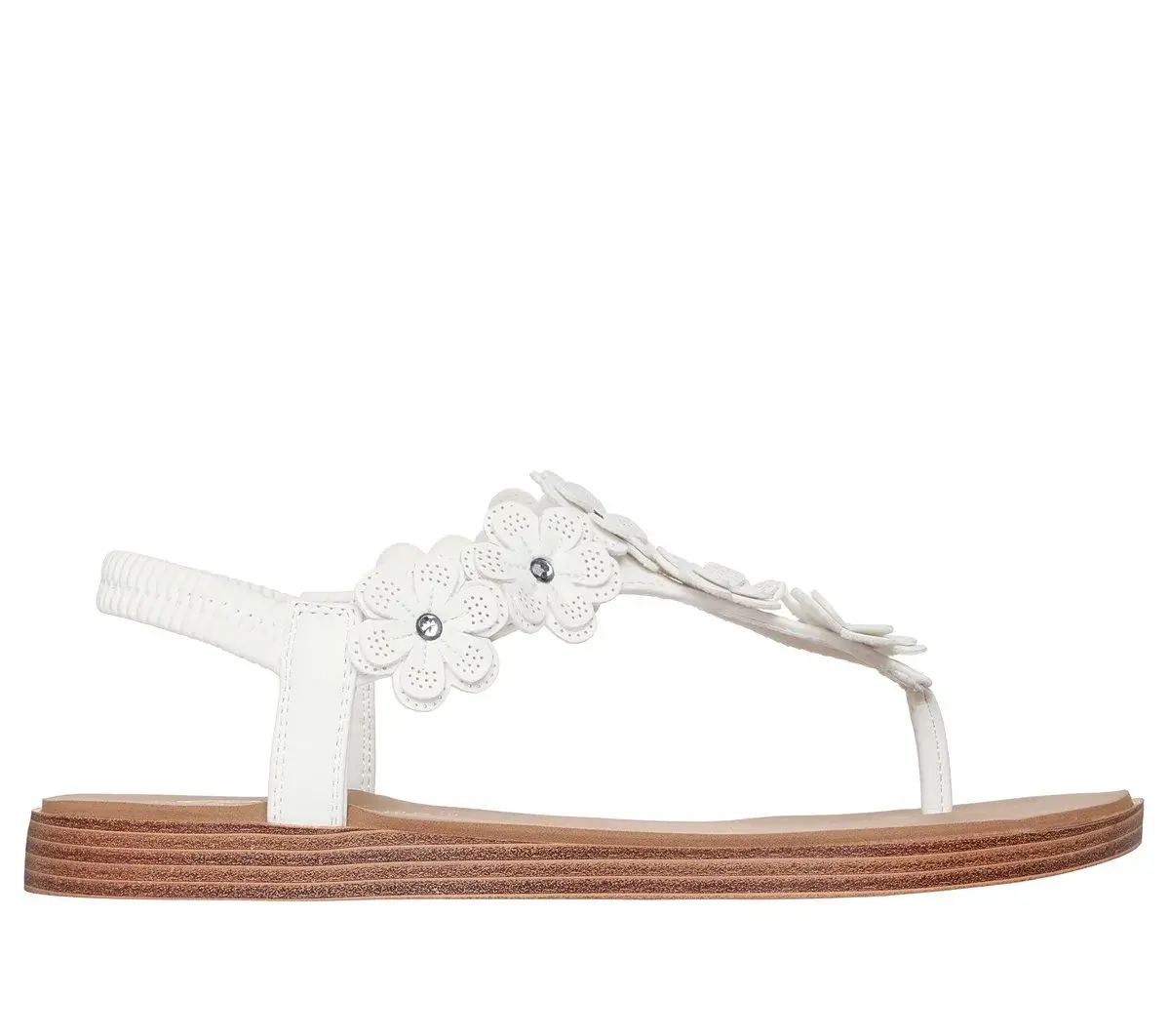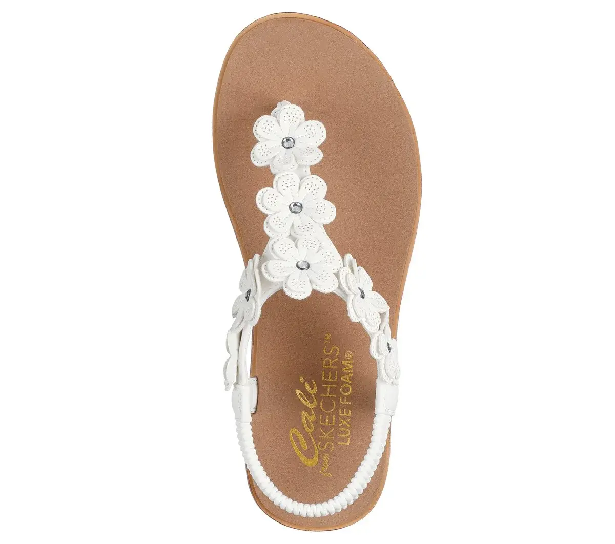 Beachy and breezy is the look wearing Skechers Cali® Summer Cove – Beach Bloom. This slingback thong sandal features a vegan leather upper with rhinestone embellished floral cutouts and a Luxe Foam® cushioned comfort footbed.