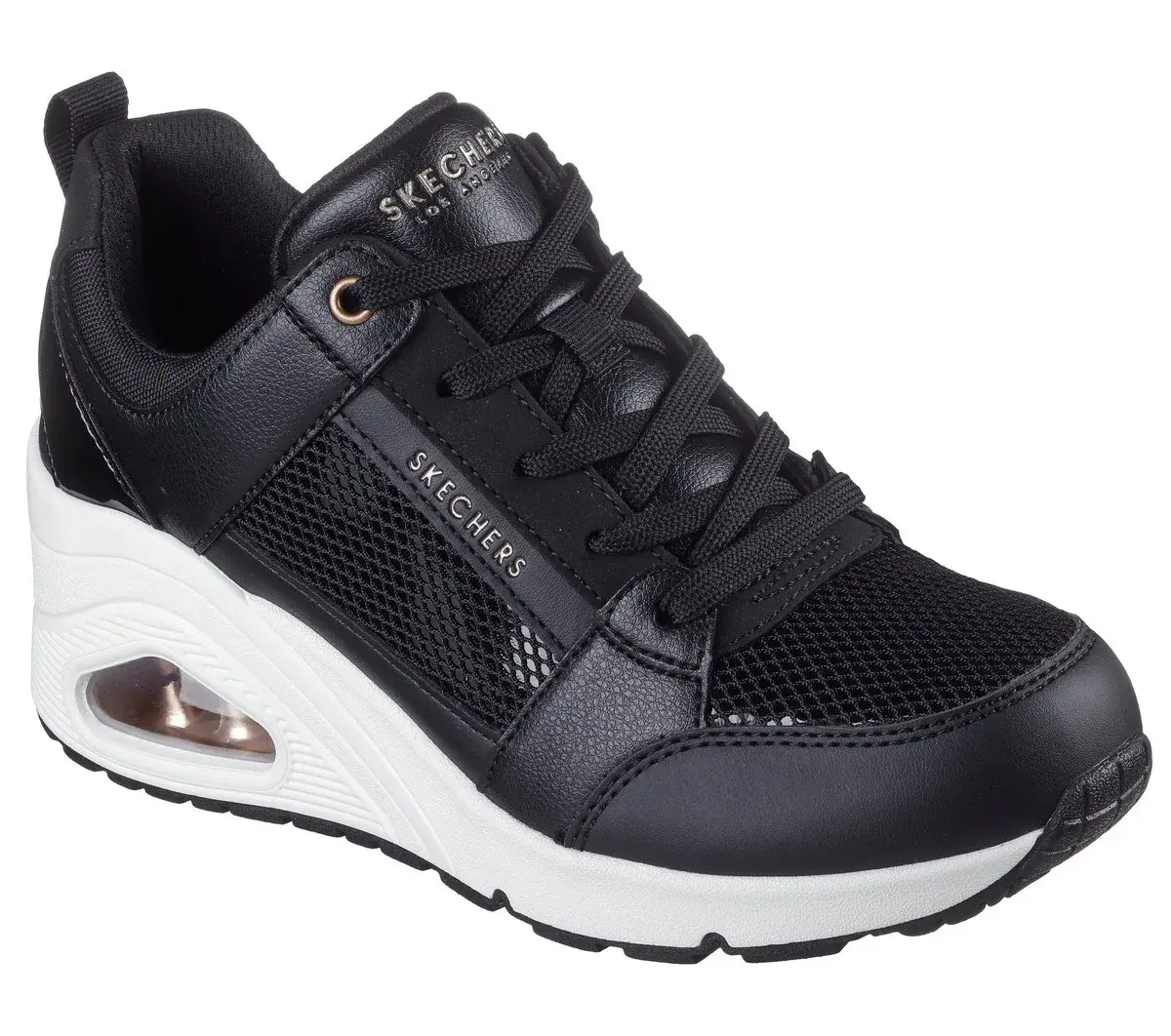 Elevate your look with stylish comfort wearing Skechers Street™ Uno Wedge – Everything Nice. This fashion style features a duraleather, mesh and leather upper with patent trim, Skechers Air-Cooled Memory Foam® insole, and a platform wedge with a visible Skech-Air® air-cushioned midsole.
