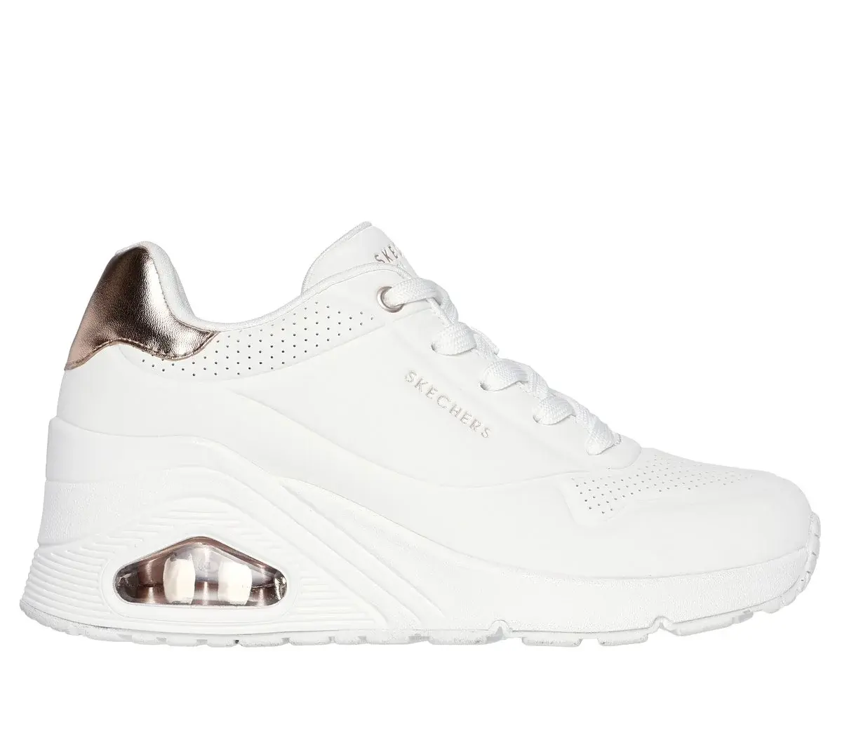 Update your wardrobe with a boost of comfort wearing Skechers Street™ Uno Wedge – HI Steps. This fashion style features a durabuck upper with metallic duraleather trim, Skechers Air-Cooled Memory Foam® insole, and a platform wedge with a visible Skech-Air® air-cushioned midsole.
