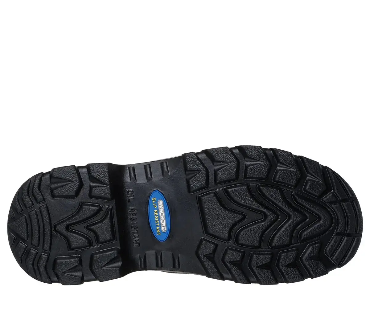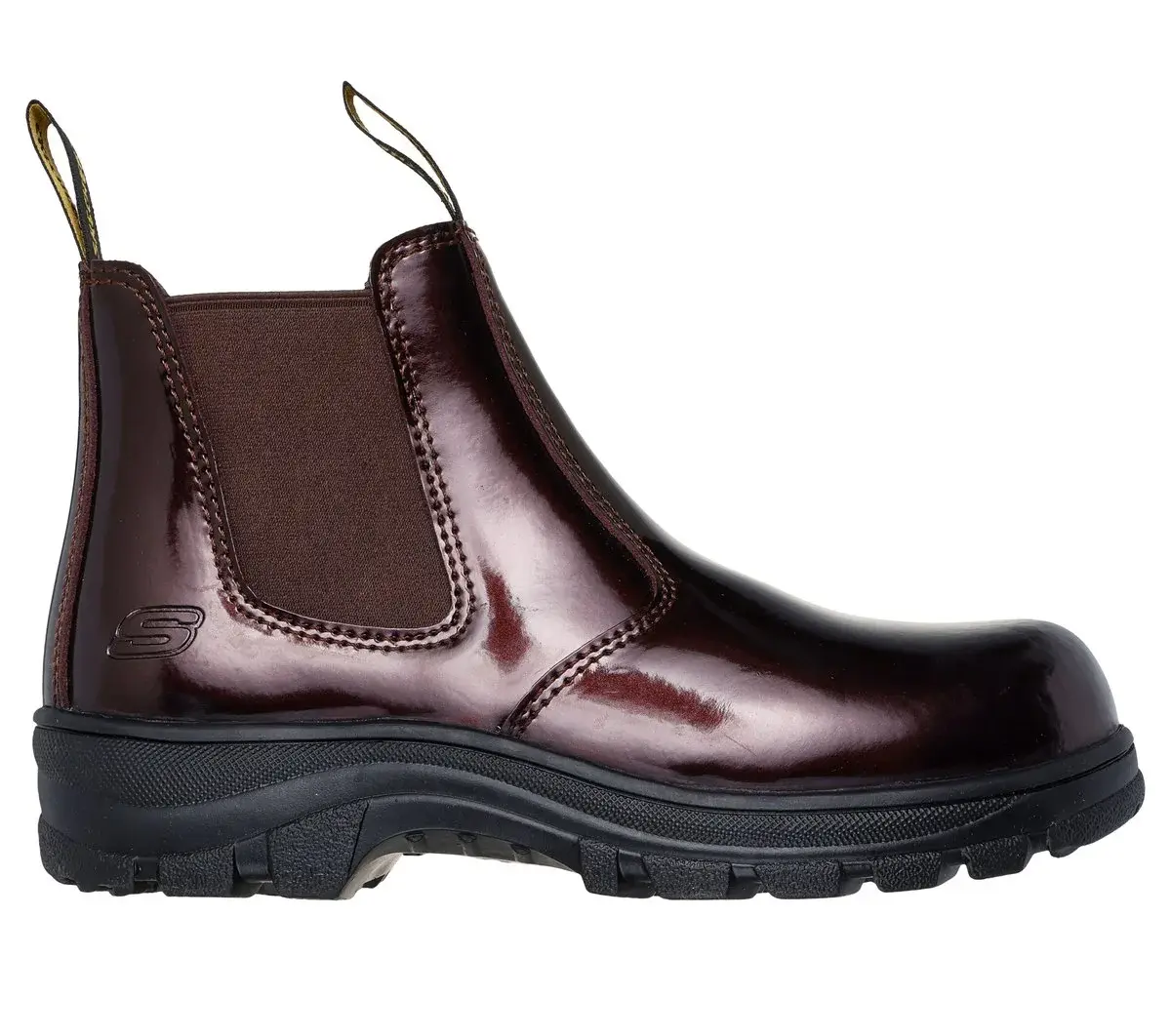 Work your shift in fashionable protection and comfort with Skechers Work™: Workshire – Sohlei. This pull-on Chelsea boot features a patent leather upper with twin gore panels, a non-metallic composite safety toe, slip-resistant outsole, and a cushioned Skechers Memory Foam™ insole.