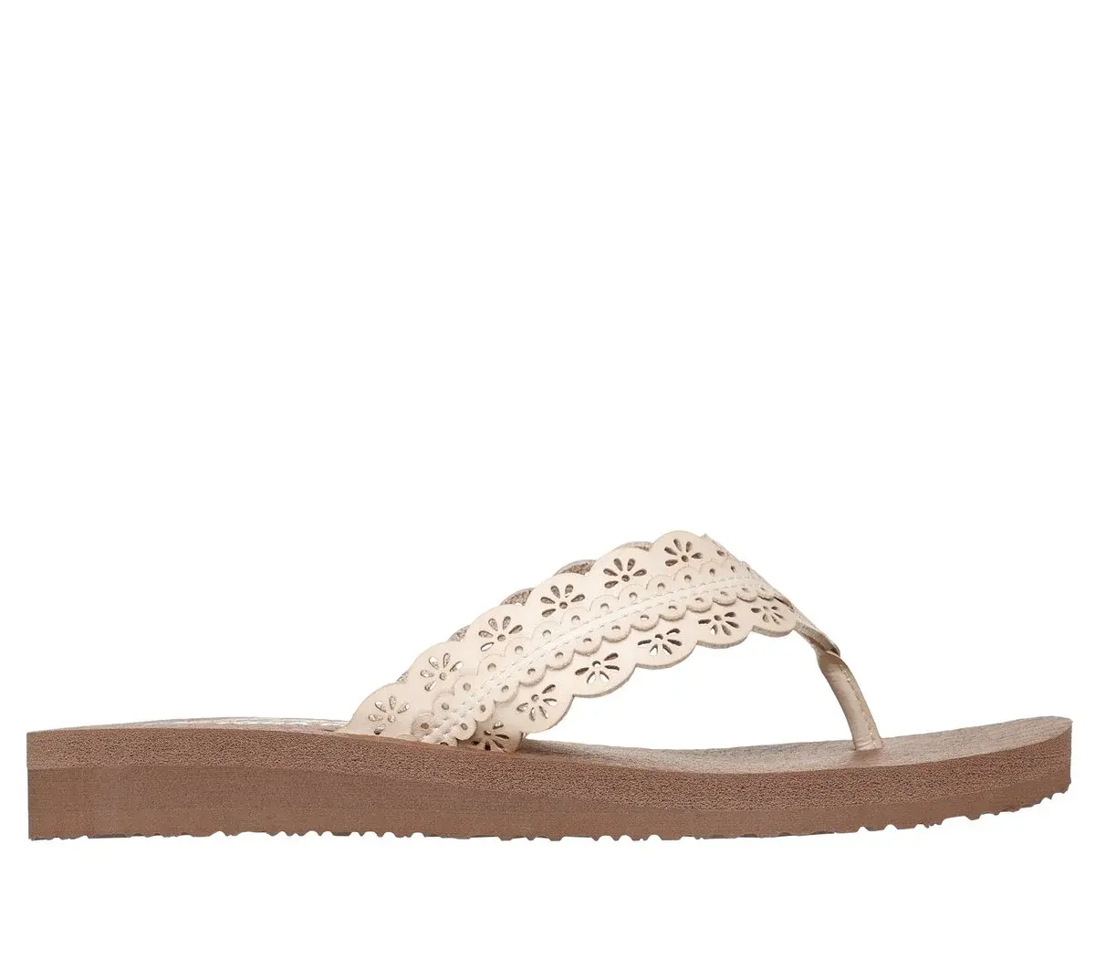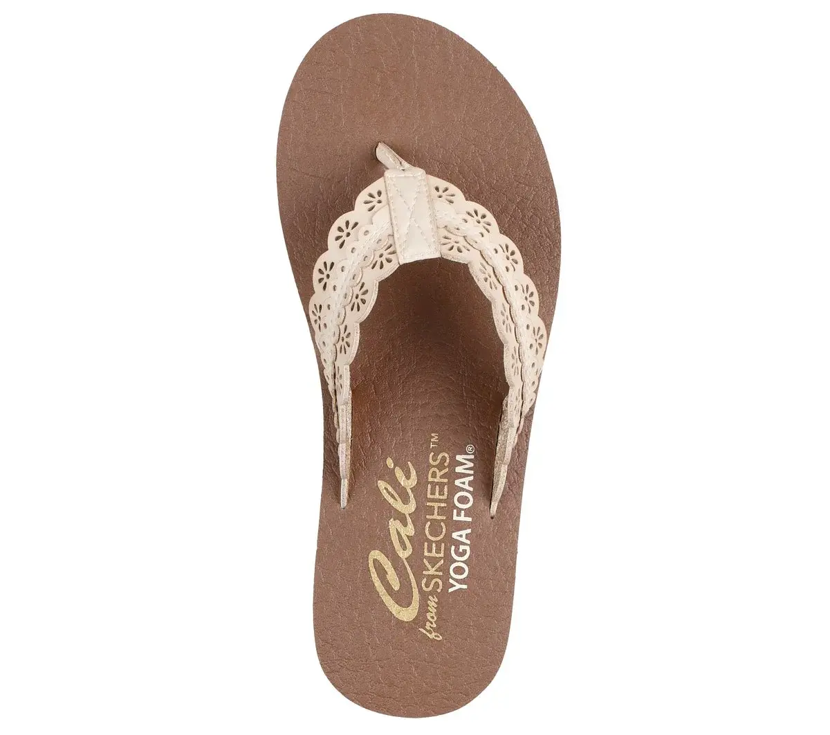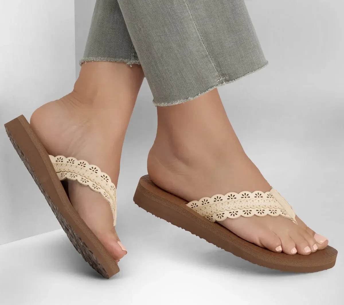 Pretty florals and comfort combine in Skechers Cali® Catching Sun. This vegan thong sandal features a floral cutout synthetic upper with a cushioned Yoga Foam® footbed.