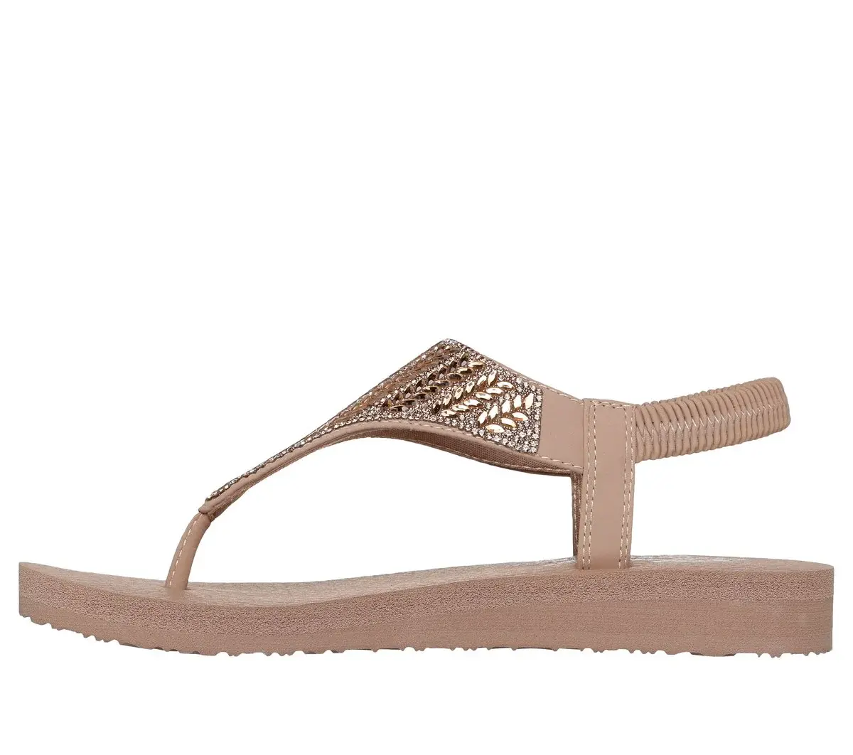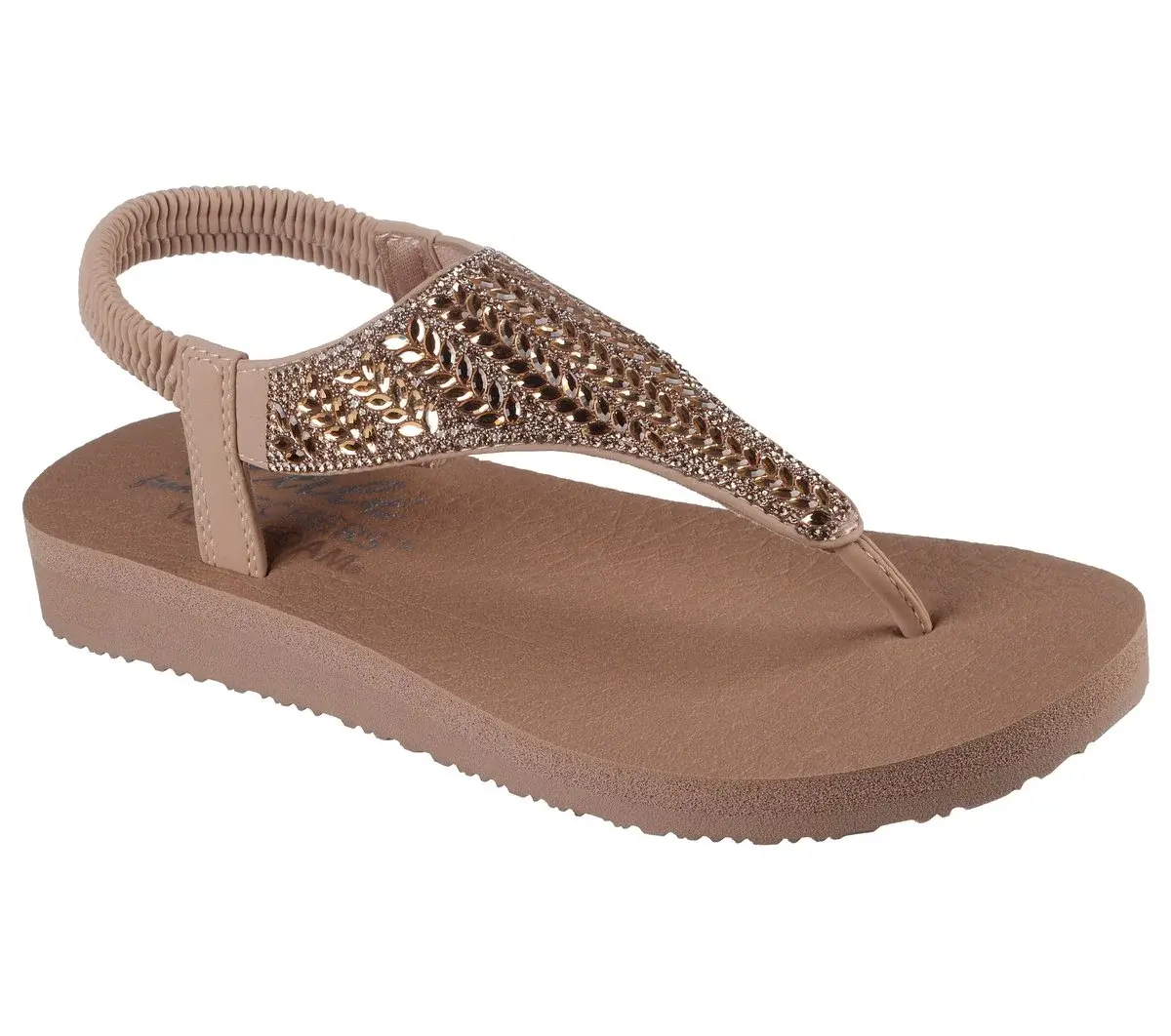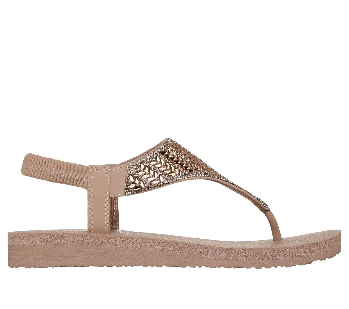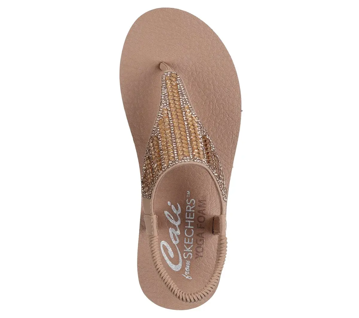 Add a little glam and comfort to your look with Skechers Cali® Glamorous Muse. This vegan pull-on slingback sandal features a synthetic upper with rhinestone embellishments and a cushioned Yoga Foam® footbed.