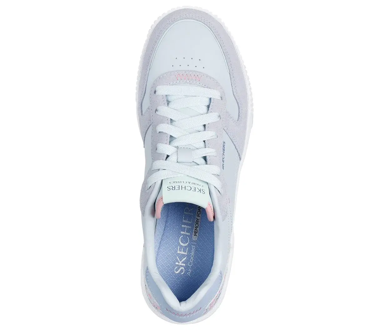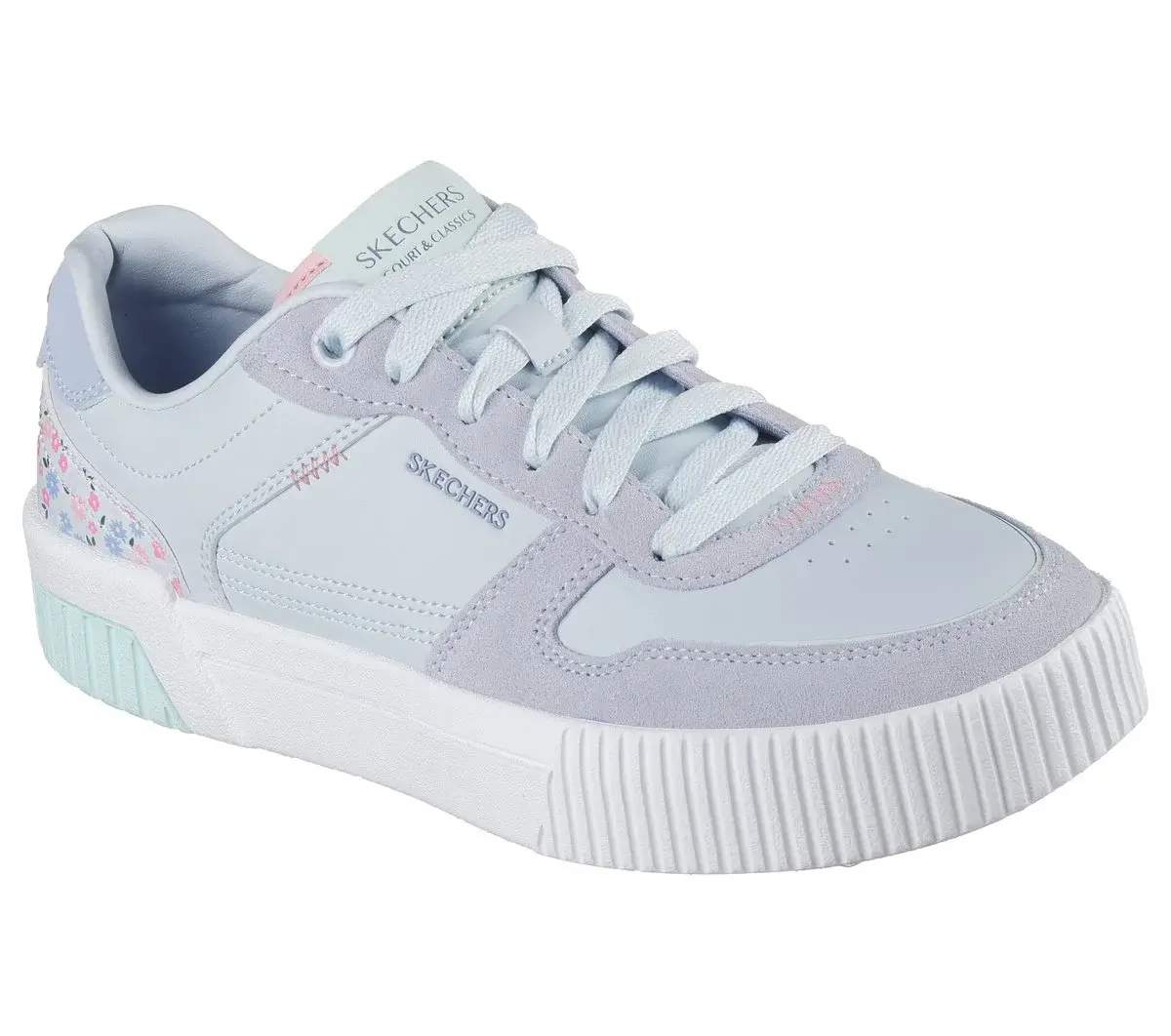 Enjoy flower adorned court comfort wearing Skechers Jade – Dainty Florals. This low-top lace-up features a color blocked duraleather and suede overlay upper with a floral print heel cup and a Skechers Air-Cooled Memory Foam® cushioned comfort insole.