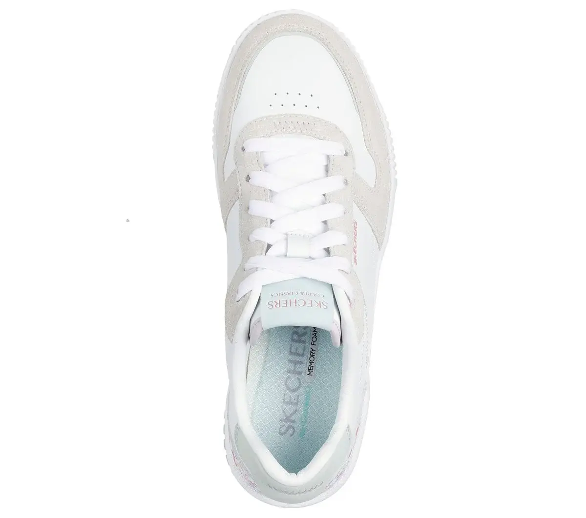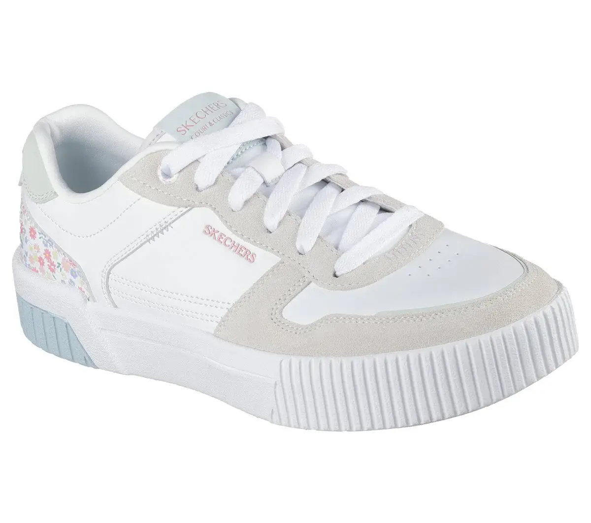 Enjoy flower adorned court comfort wearing Skechers Jade – Dainty Florals. This low-top lace-up features a color blocked duraleather and suede overlay upper with a floral print heel cup and a Skechers Air-Cooled Memory Foam® cushioned comfort insole.