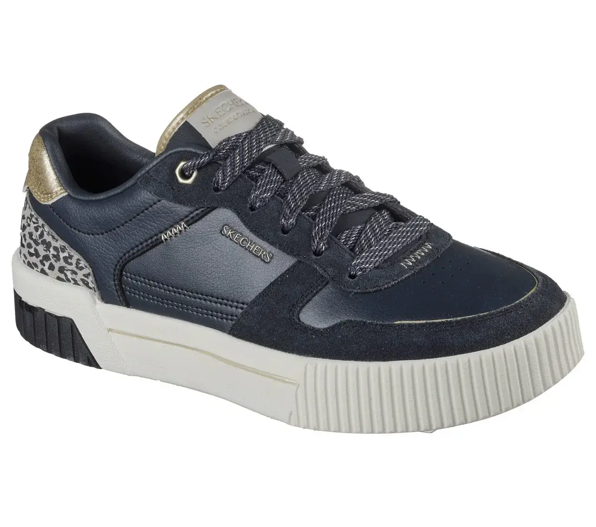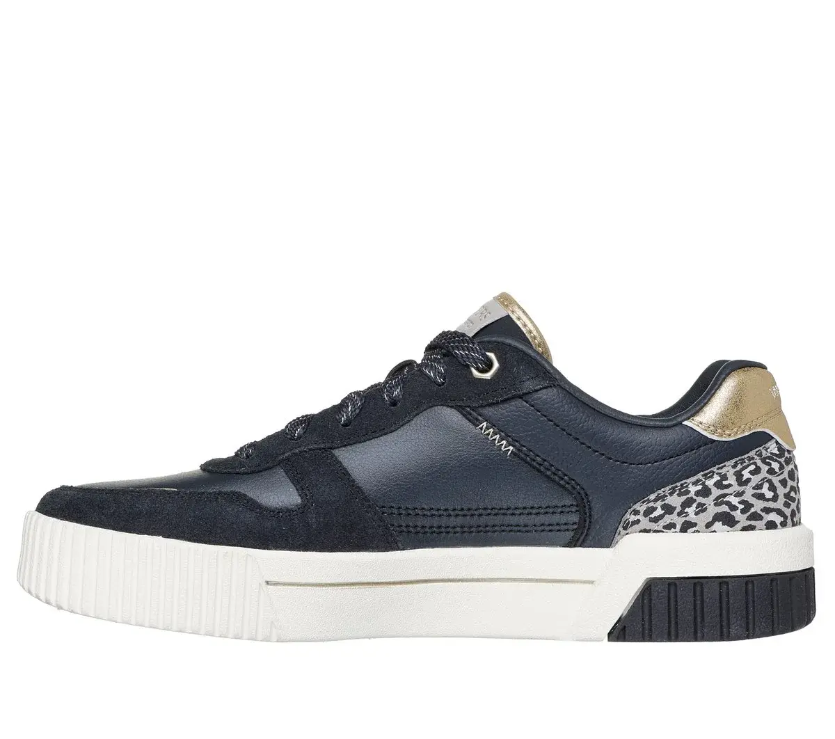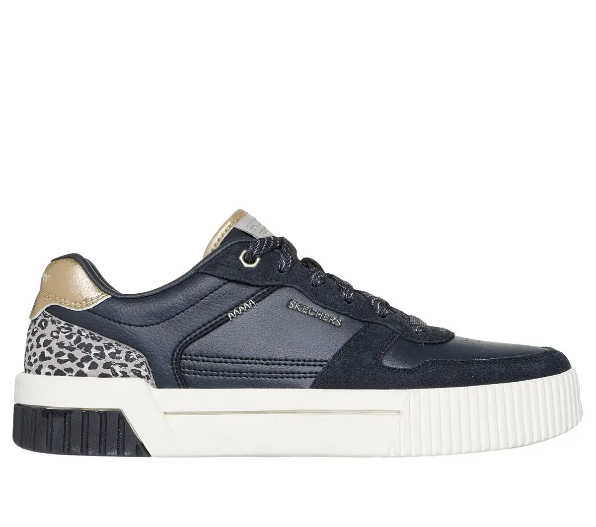 Enjoy purrrfectly styled court comfort wearing Skechers Jade – Lustrous Luxury. This low-top lace-up features a duraleather and suede overlay upper with a leopard print heel cup, metallic mustache detail, and a Skechers Air-Cooled Memory Foam[registered cushioned comfort insole.
