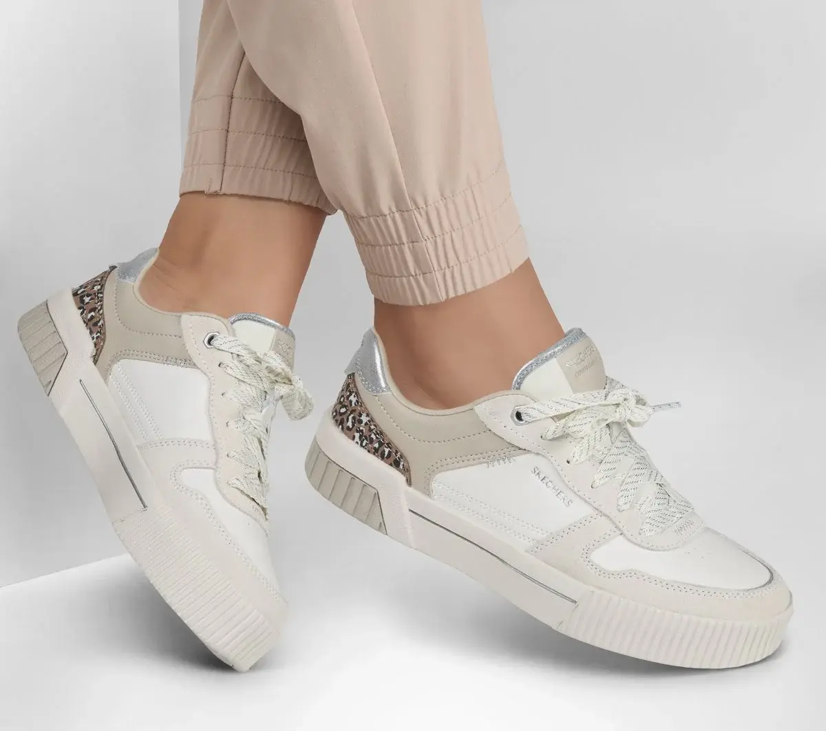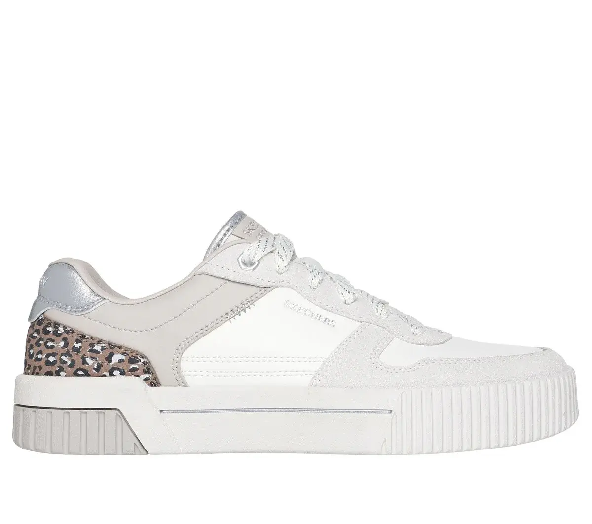 Enjoy purrrfectly styled court comfort wearing Skechers Jade – Lustrous Luxury. This low-top lace-up features a duraleather and suede overlay upper with a leopard print heel cup, metallic mustache detail, and a Skechers Air-Cooled Memory Foam[registered cushioned comfort insole.
