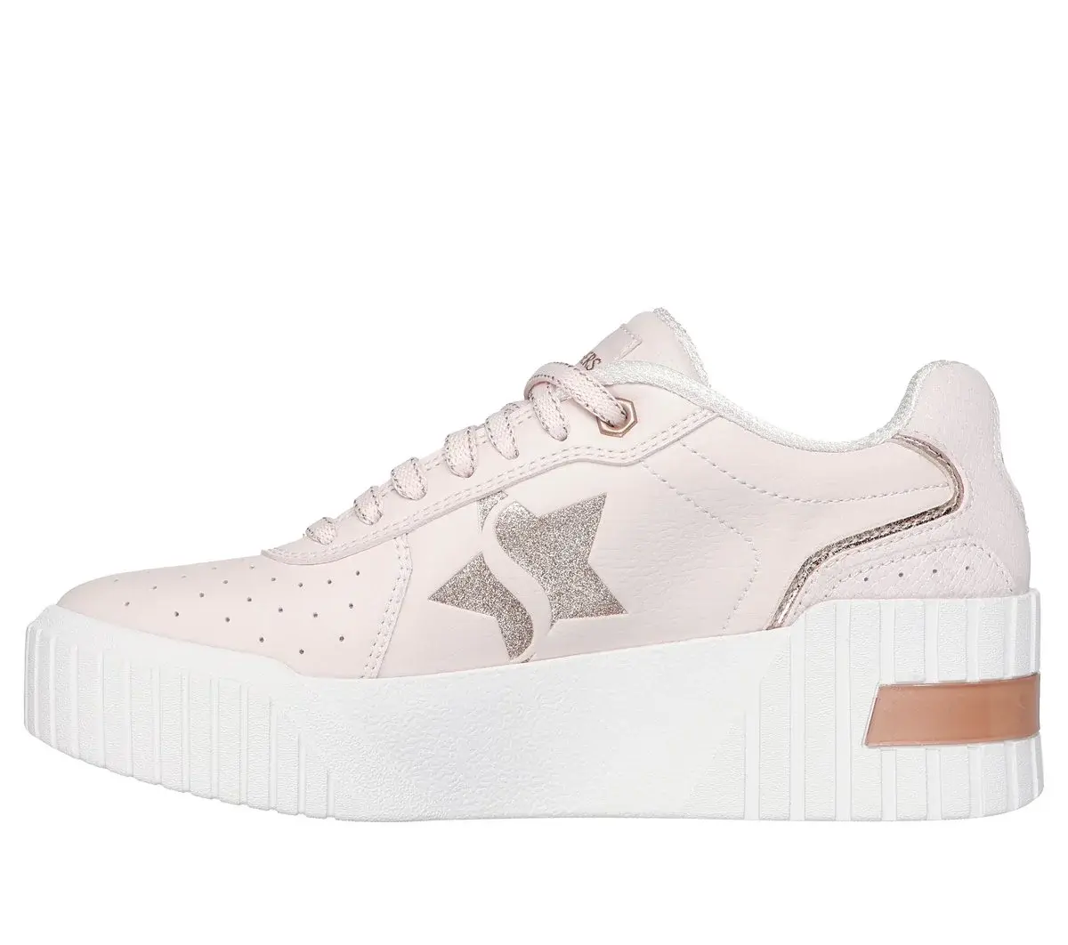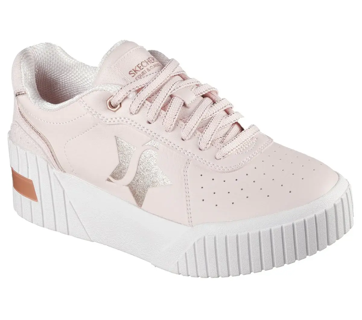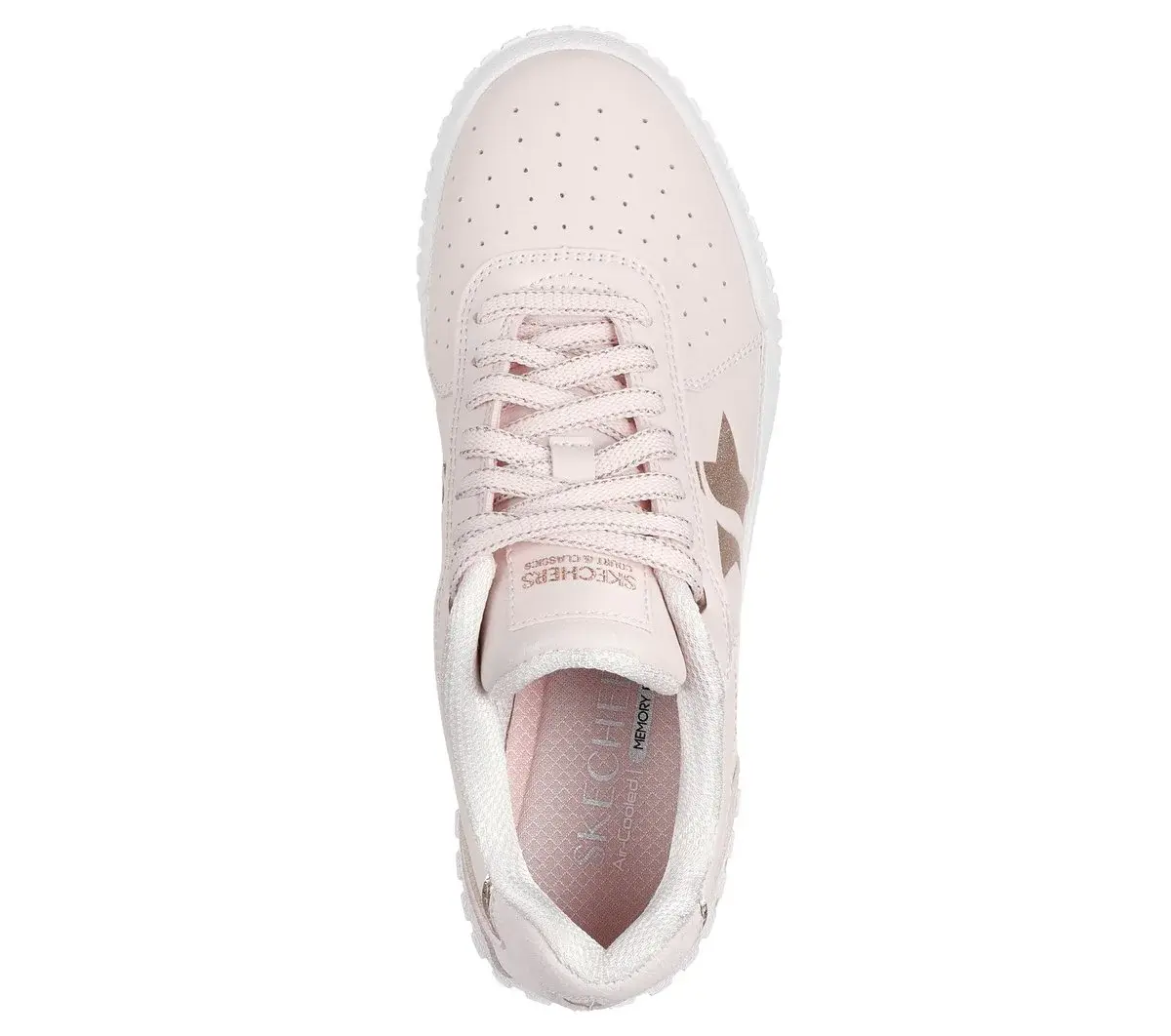 Enjoy classic court-style looks with Skechers Jumbo Jade – Lifted Chic. This low-top lace-up features a duraleather upper with reptile textured details and metallic overlays, plus a cushioned Skechers Air-Cooled Memory Foam® comfort insole.
