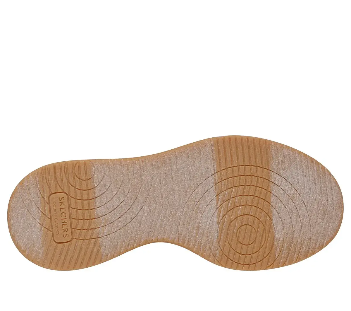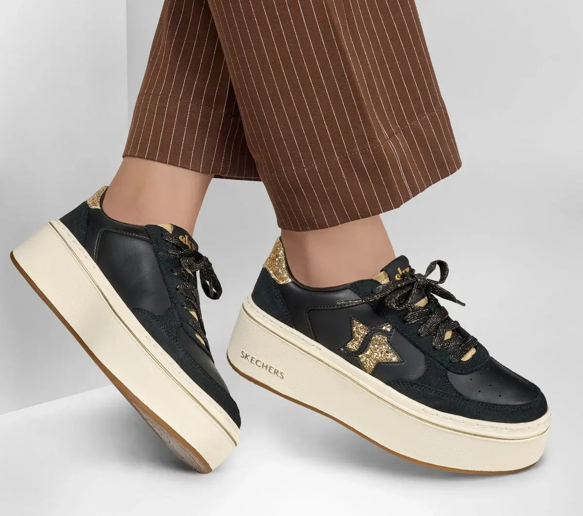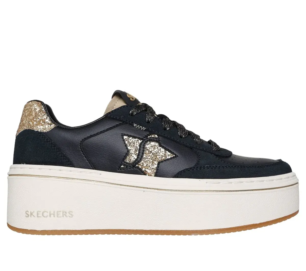 Reach new heights of style with Skechers Paloma – Brightest Star. This lace-up platform court style features a duraleather and genuine suede overlay upper with a glittery star detail and a cushioned Skechers Air-Cooled Memory Foam® comfort insole.