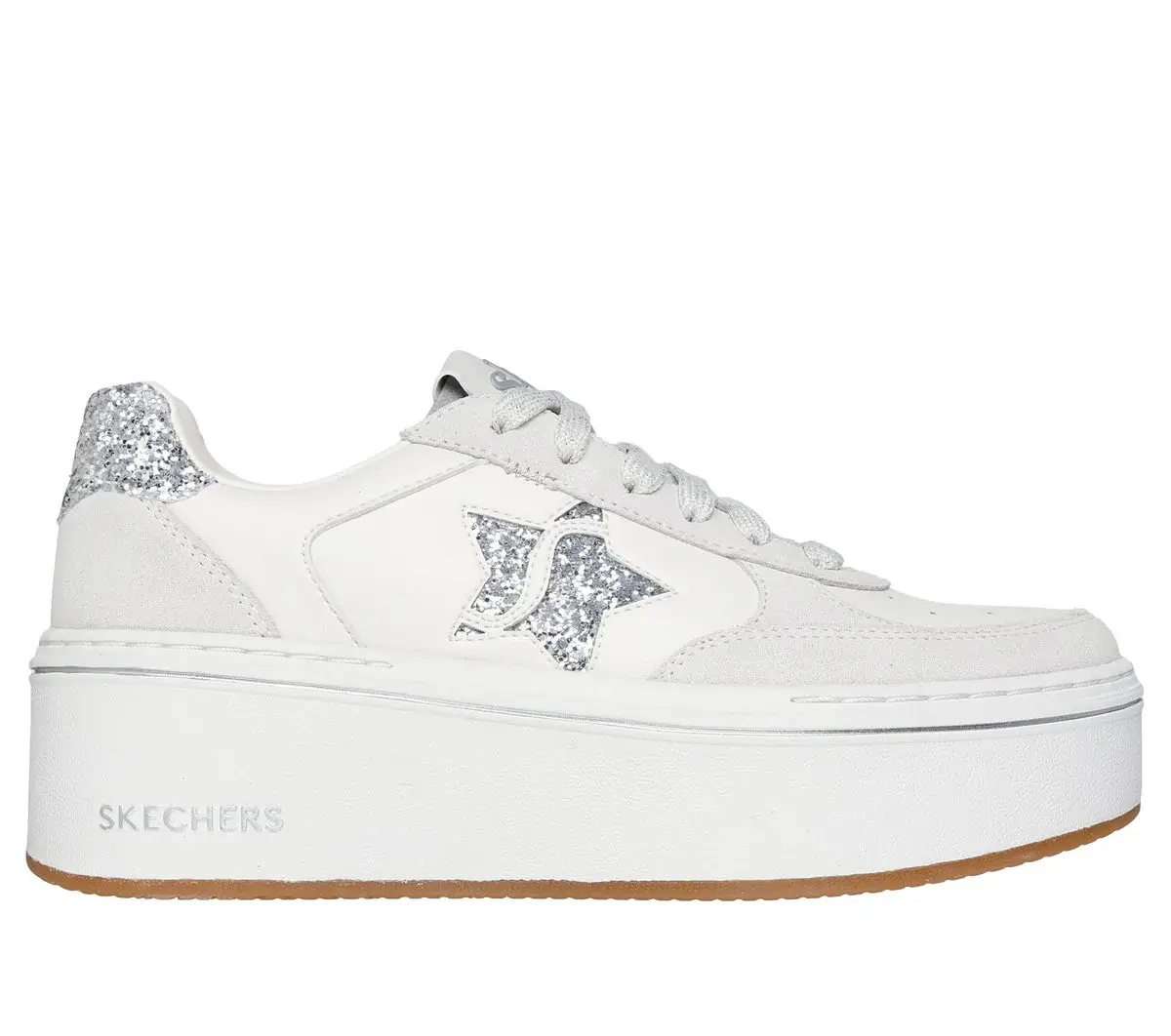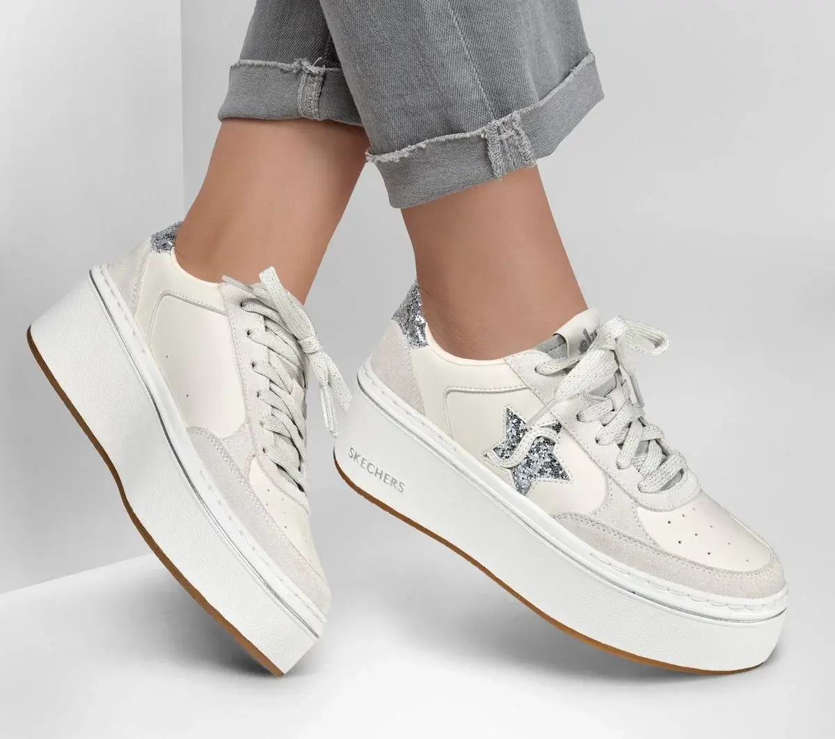 Reach new heights of style with Skechers Paloma – Brightest Star. This lace-up platform court style features a duraleather and genuine suede overlay upper with a glittery star detail and a cushioned Skechers Air-Cooled Memory Foam® comfort insole.
