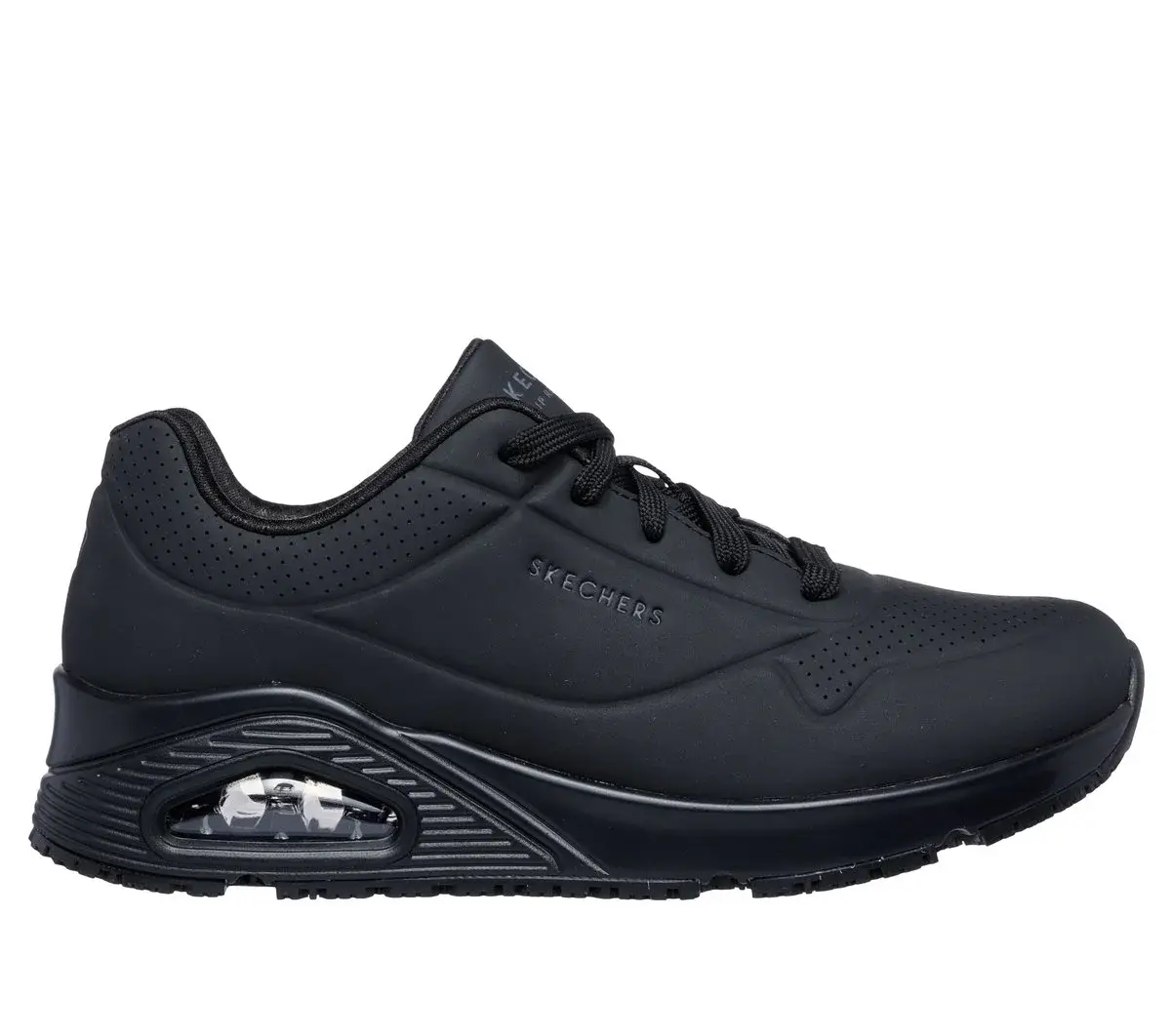 A favorite style arrives in comfort and safety with Skechers Work™ Relaxed Fit®: Uno SR. This slip-resistant utility design features a durable perforated synthetic durabuck upper with a Skechers Air-Cooled Memory Foam® insole and Skech-Air® visible airbag midsole.