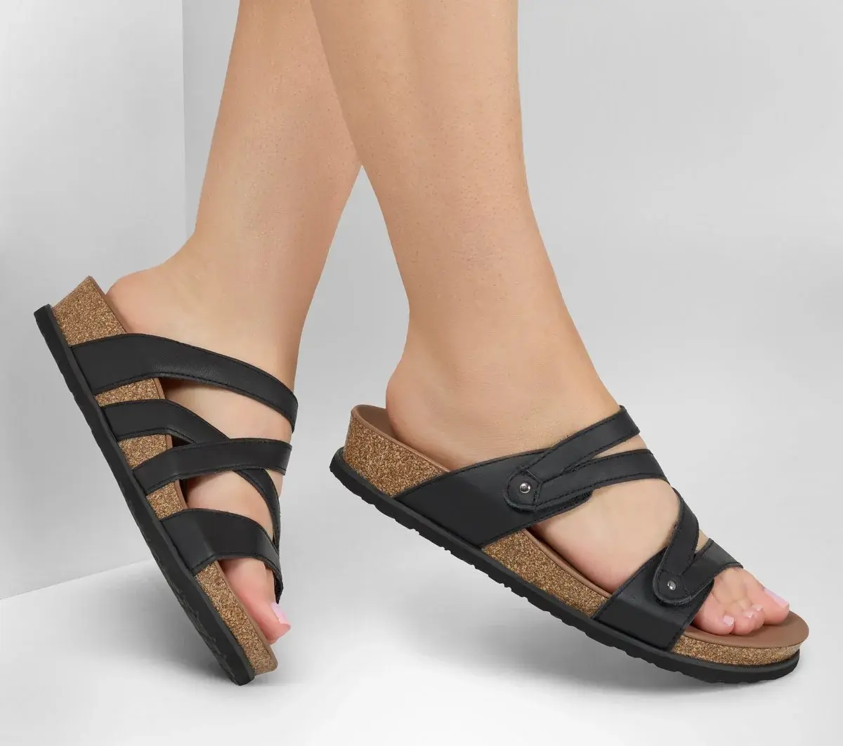 Unwind in stylish warm weather comfort wearing Skechers Arch Fit® Granola Slim. This strappy slide sandal has been granted the APMA Seal of Acceptance and features a leather upper with two adjustable closures and a supportive Arch Fit® footbed with Luxe Foam® cushioning.