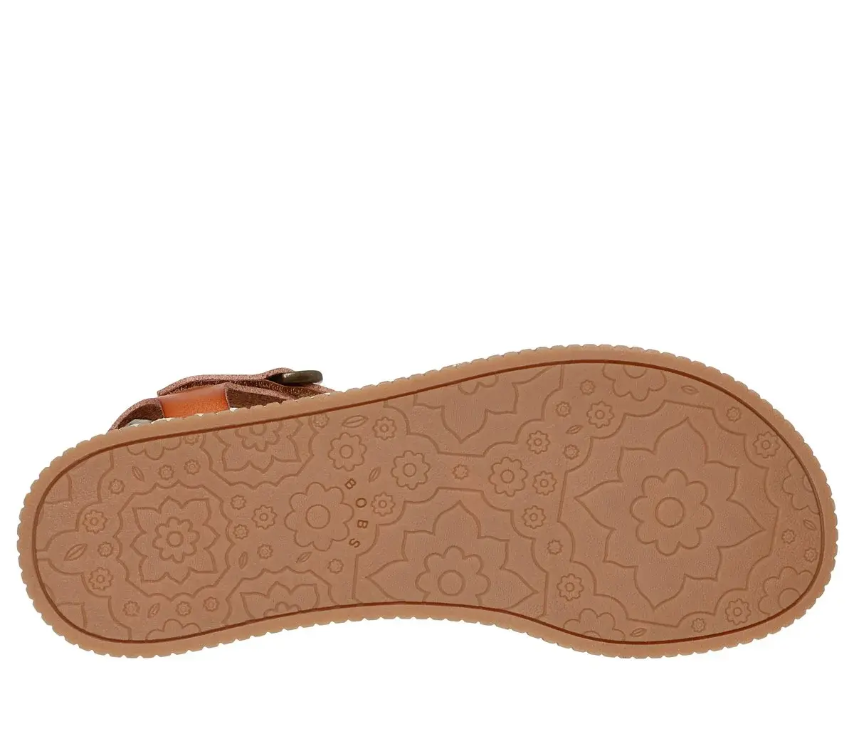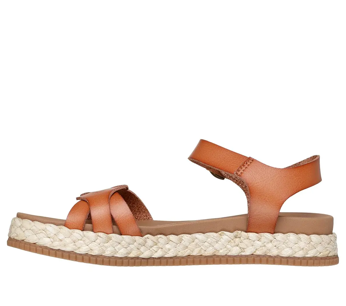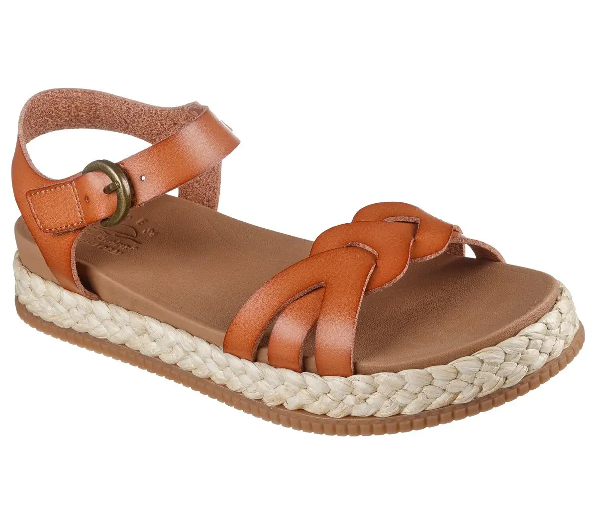 Embrace the romance of the warm outdoors wearing BOBS® from Skechers® Stormy Kiss. This open toe sandal features a faux leather upper with a buckled instep strap, braided raffia midsole trim, and a Skechers Plush Foam® footbed. BOBS® from Skechers® is committed to saving the lives of pets in need.
