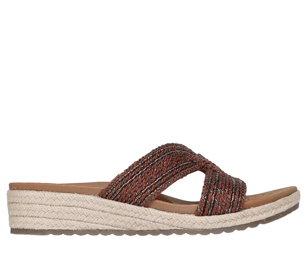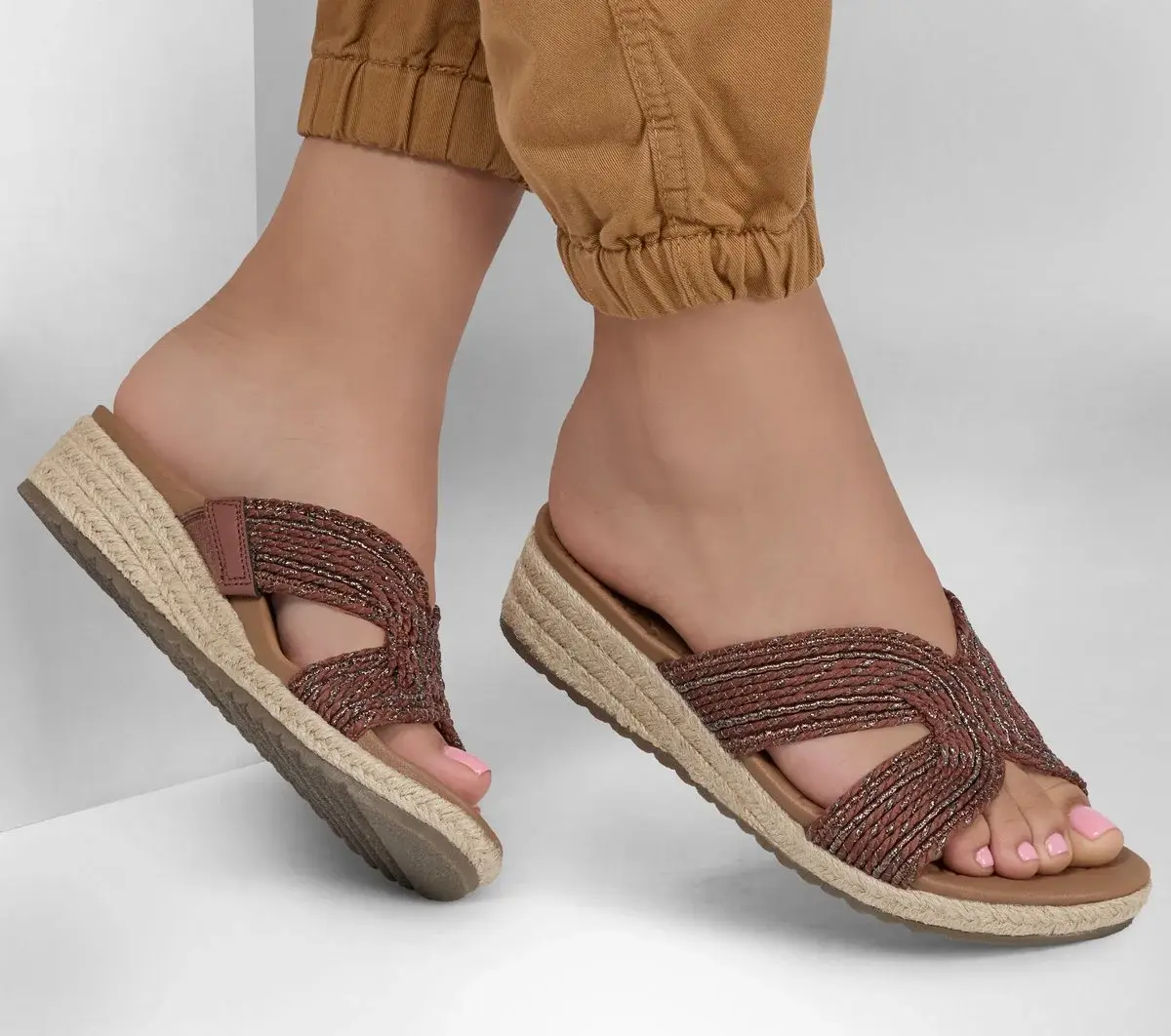 Summery style and top-notch comfort combine in Skechers Cali® Breezie – Shimmer Waves. This vegan wedge sandal features a metallic jute H-band upper, an espadrille midsole with jute trim, and a cushioned Luxe Foam® footbed.