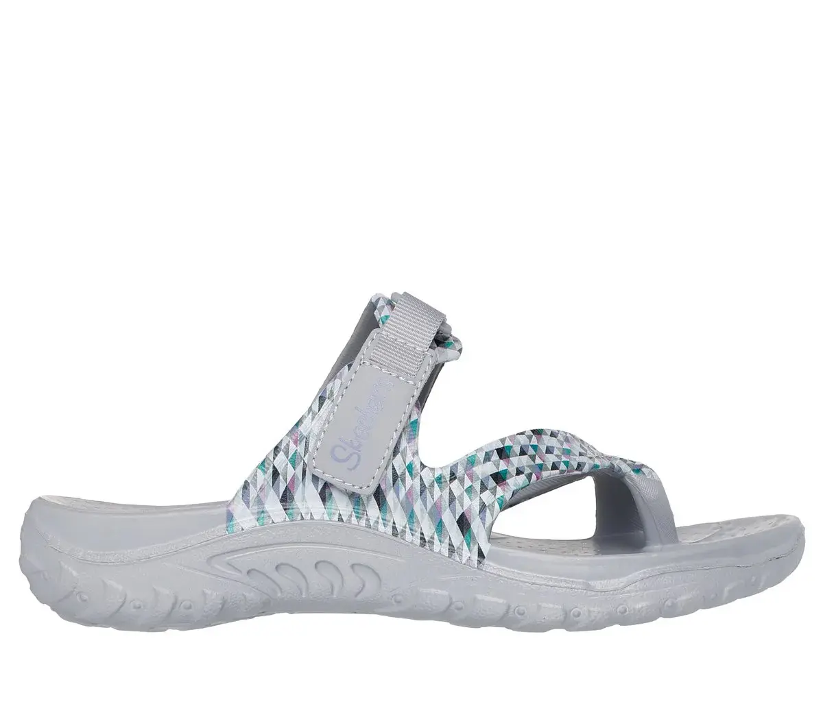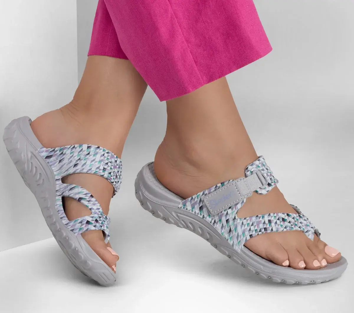 Enjoy breezy comfort in style with Skechers Foamies®: Reggae – Scenery. This sculpted toe-loop sandal features a geometric print Foamies® EVA upper with an adjustable woven strap, and a cushioned comfort footbed.