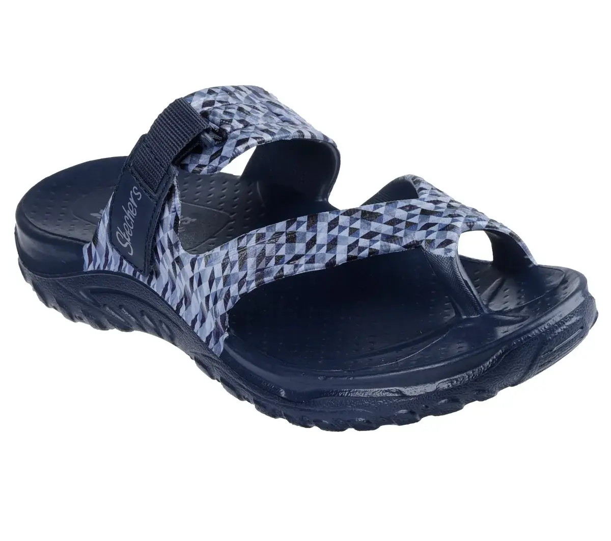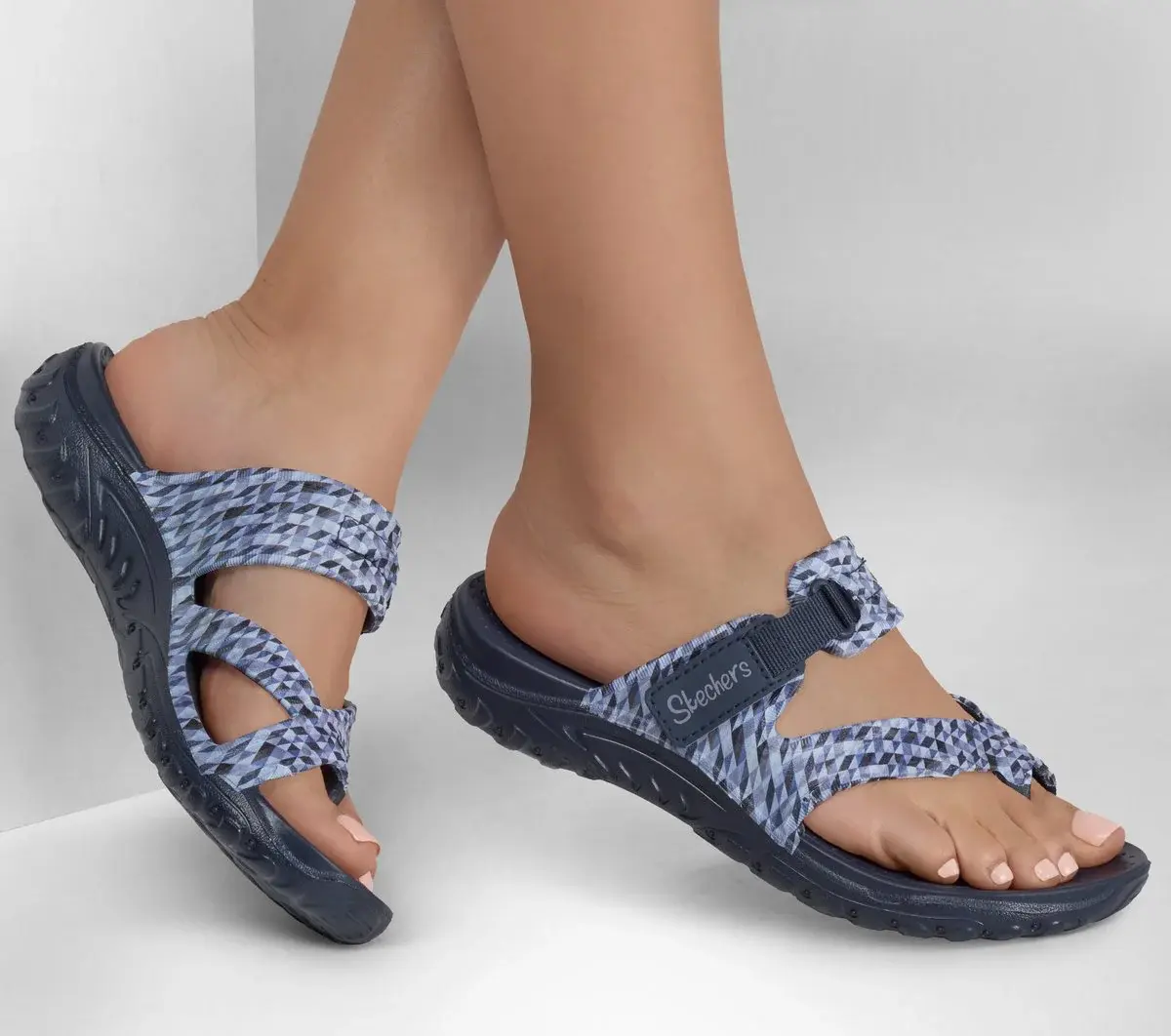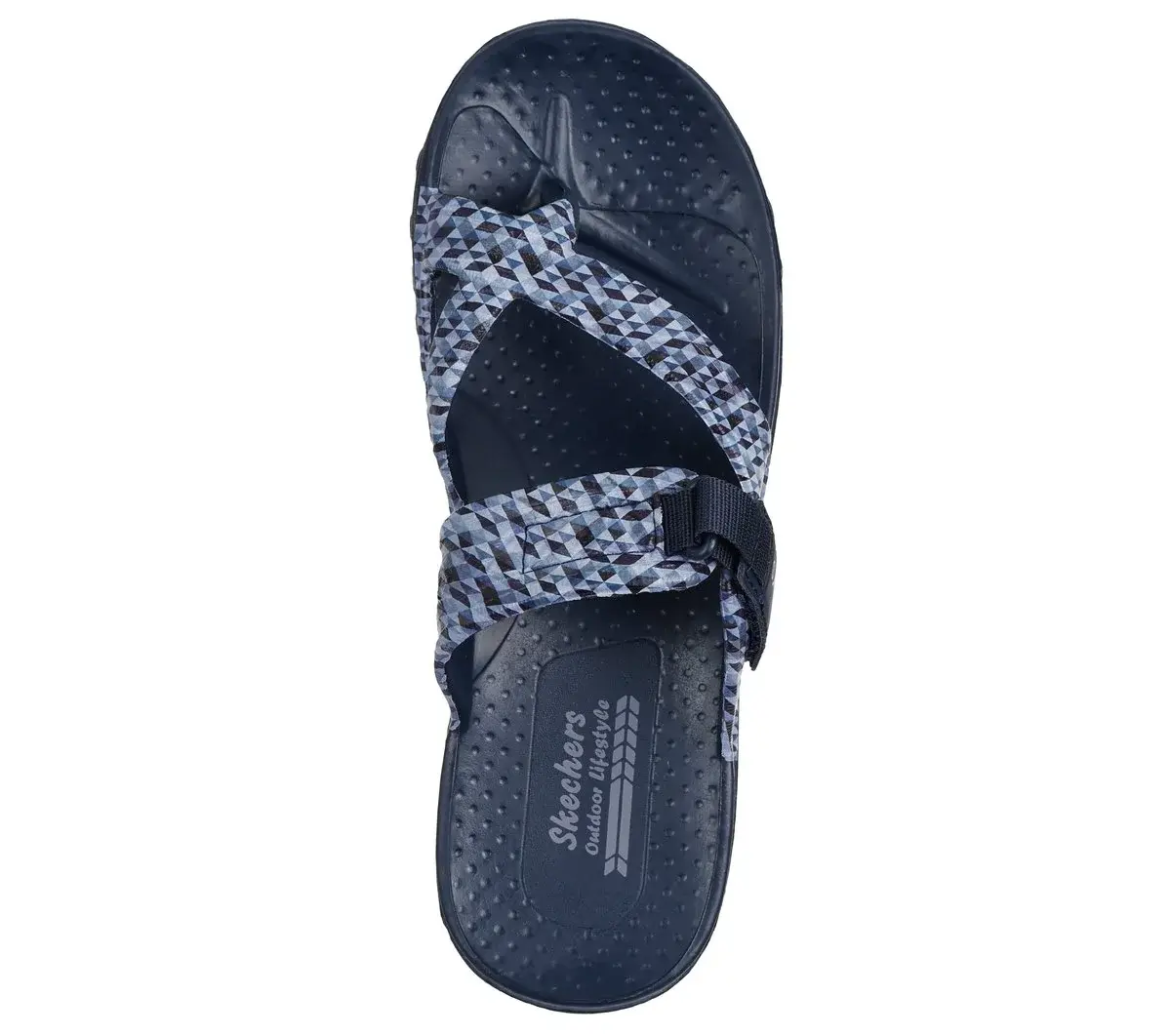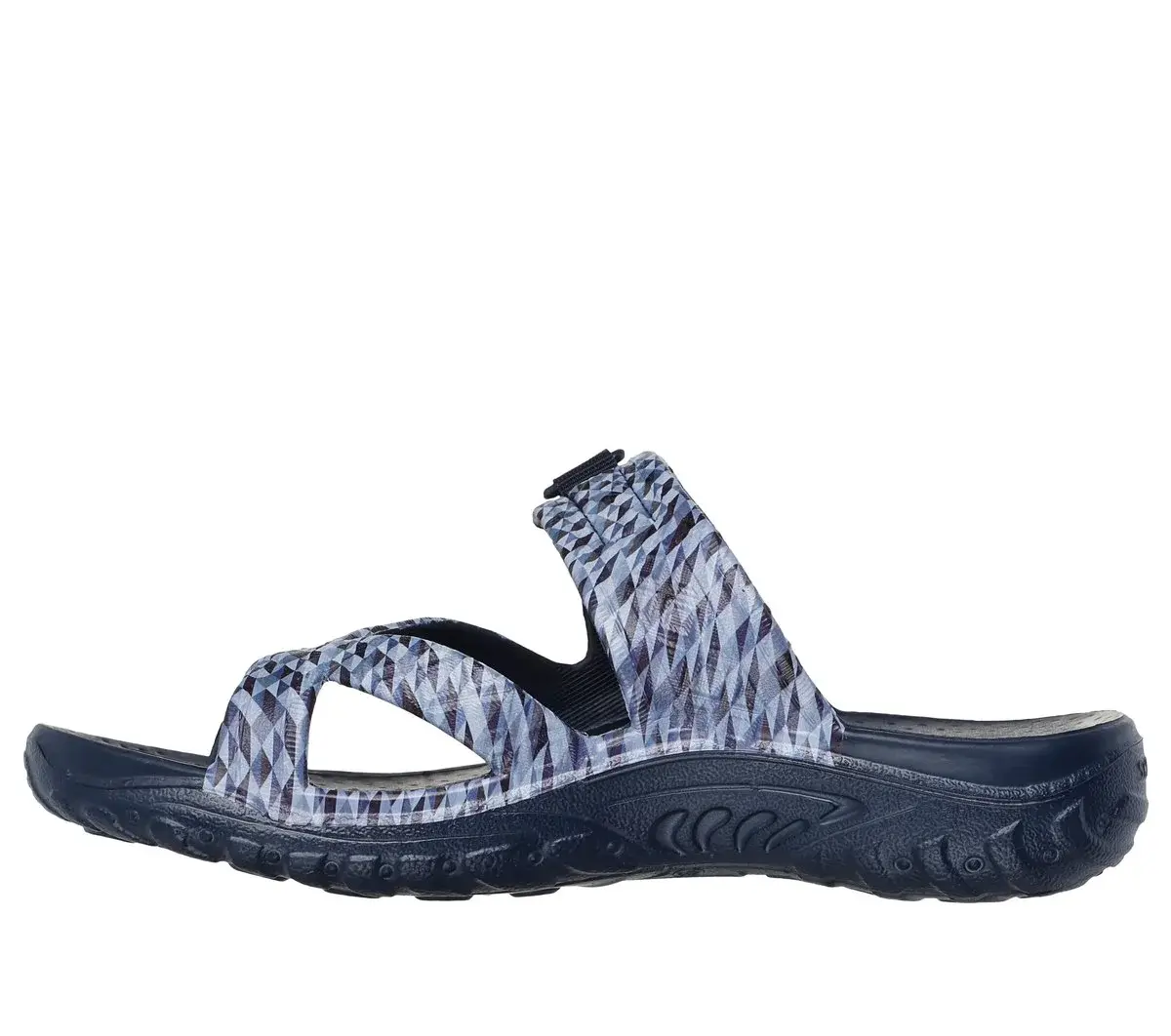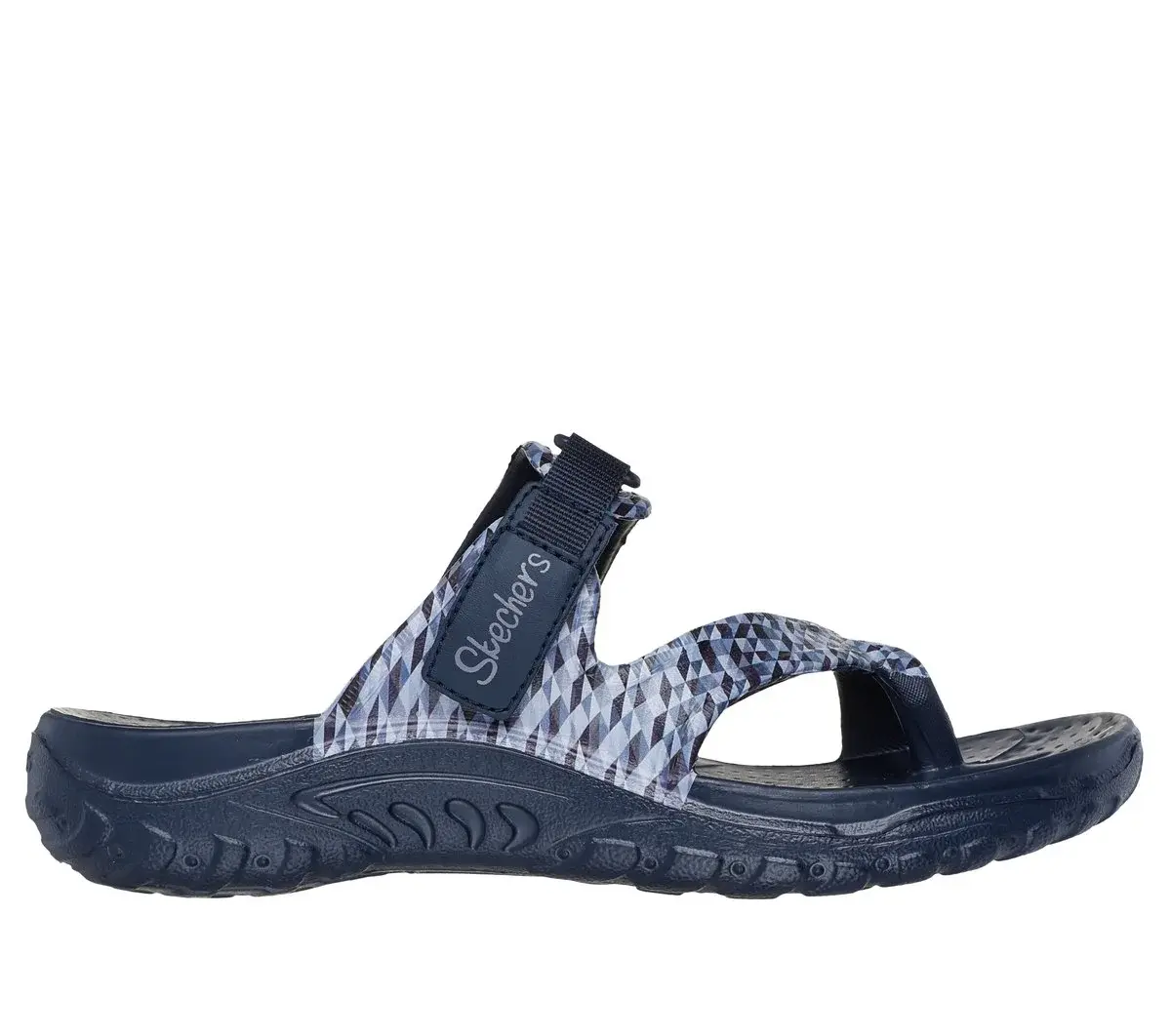 Enjoy breezy comfort in style with Skechers Foamies®: Reggae – Scenery. This sculpted toe-loop sandal features a geometric print Foamies® EVA upper with an adjustable woven strap, and a cushioned comfort footbed.