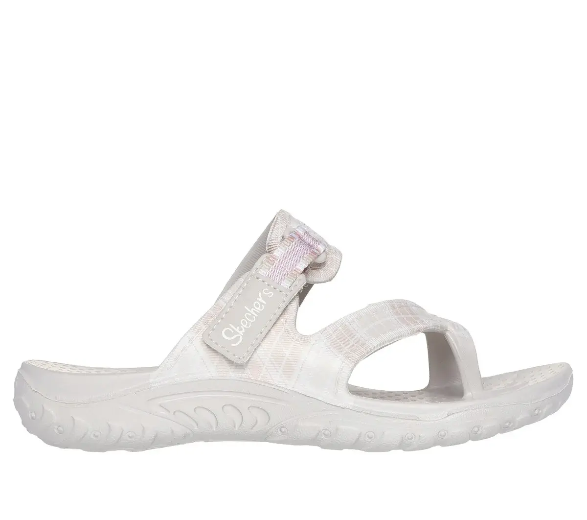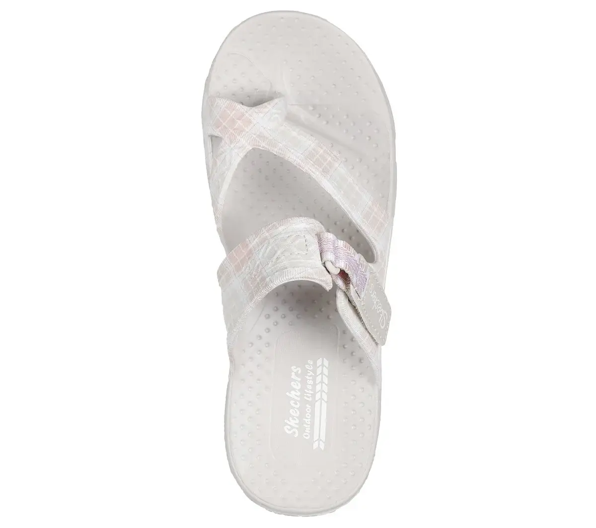 Enjoy breezy comfort in style with Skechers Foamies®: Reggae – Tartan. This vegan toe-thong sandal features a plaid printed Foamies® upper with an adjustable strap, and a cushioned comfort footbed.