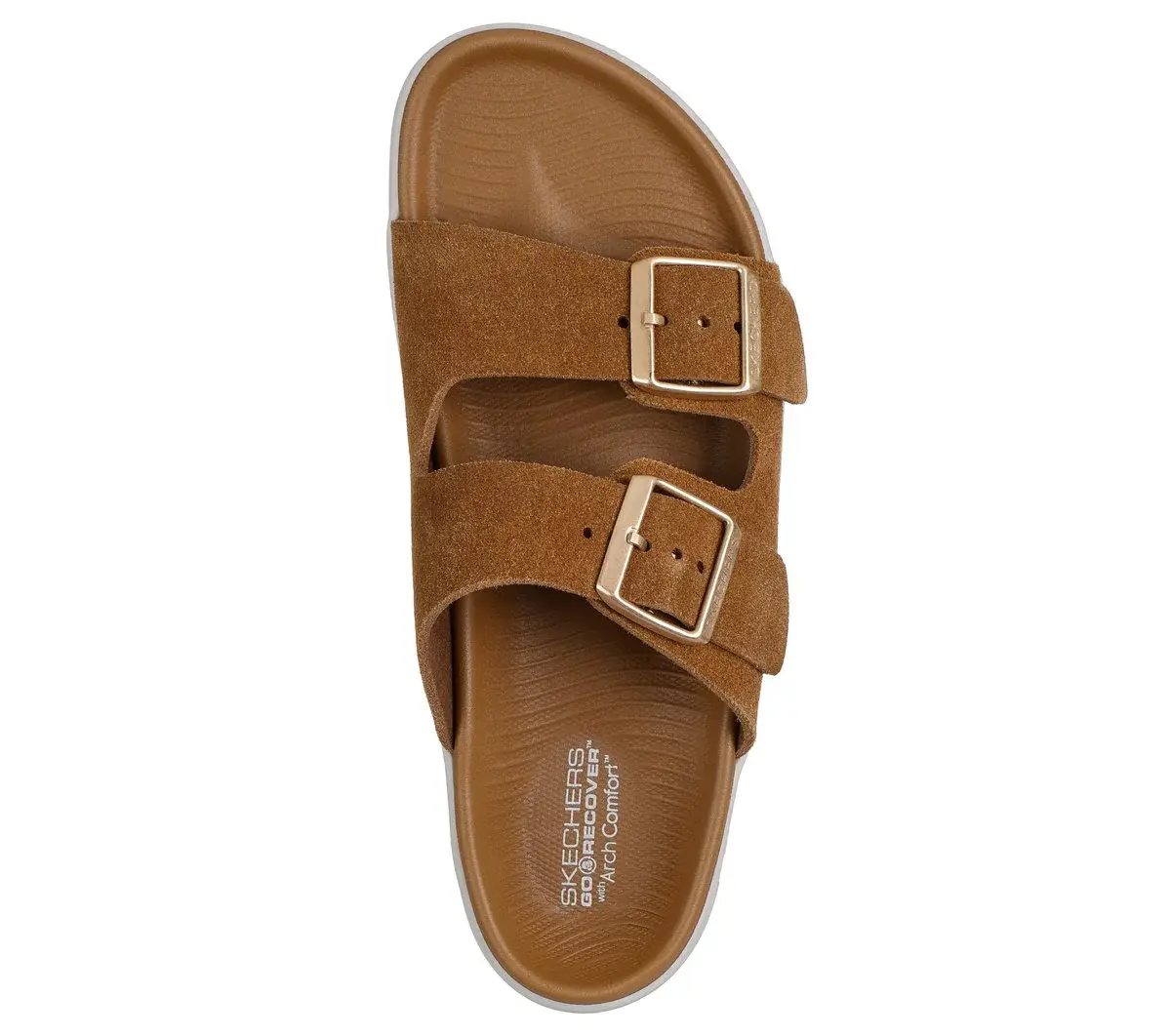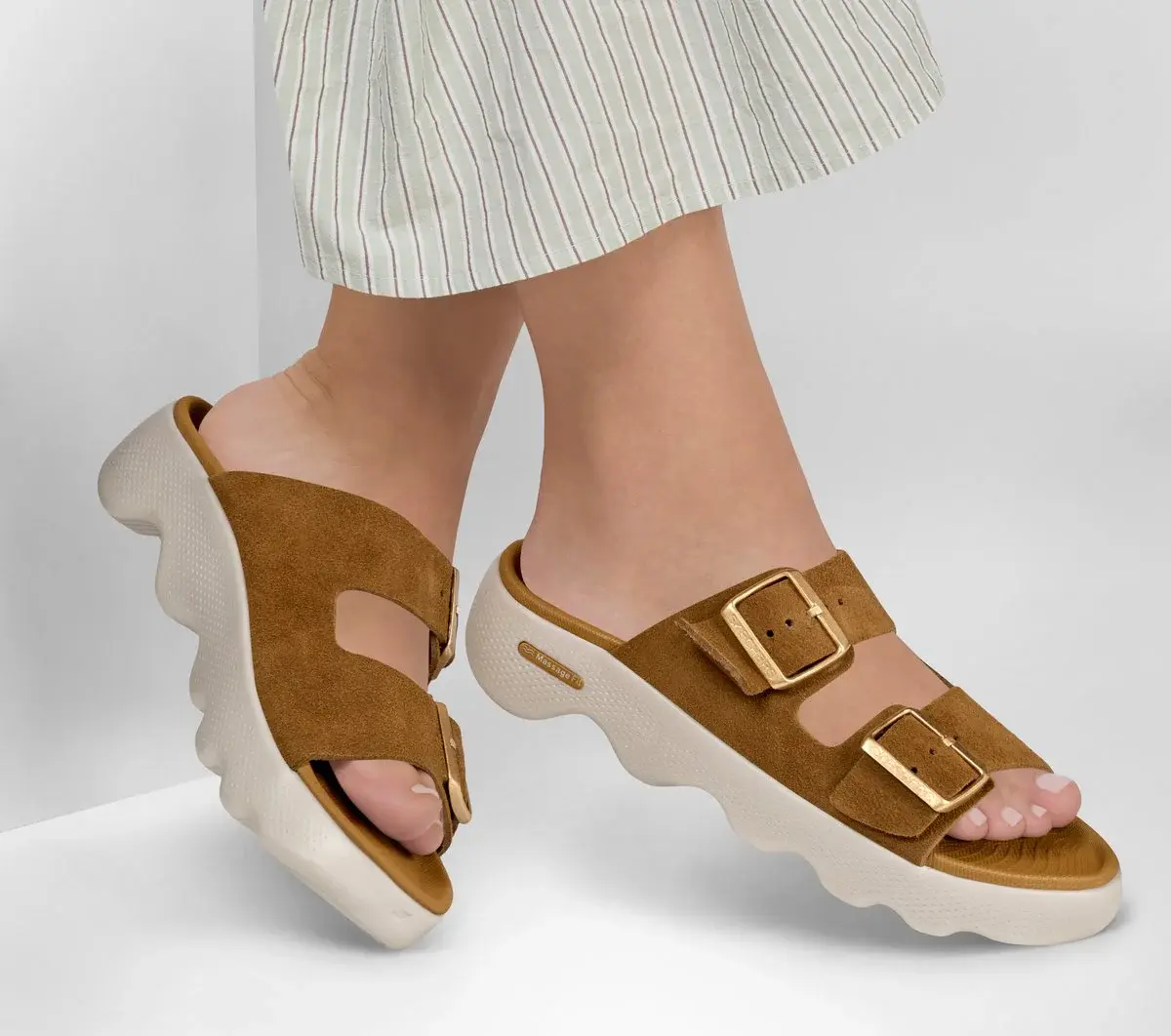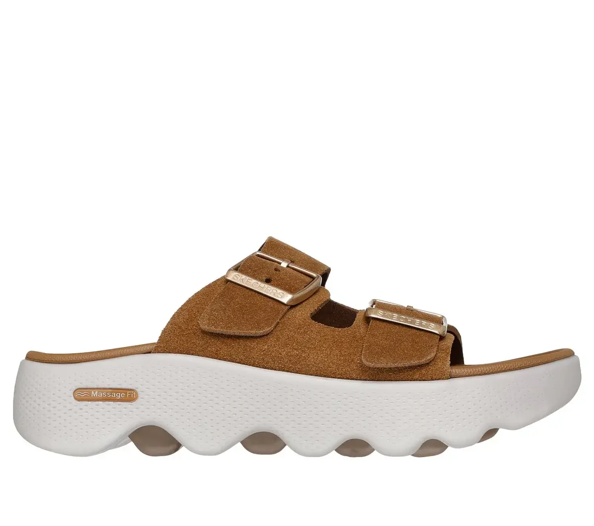 Feel cloud-like comfort with every step in Skechers Massage Fit™ Revive – Honey. This innovative vegan recovery sandal features a double band suede upper with buckle detail, an ultra-lightweight, responsive HYPER BURST® cushioned midsole, and a contoured Goga Mat® footbed with Arch Comfort® for added support.