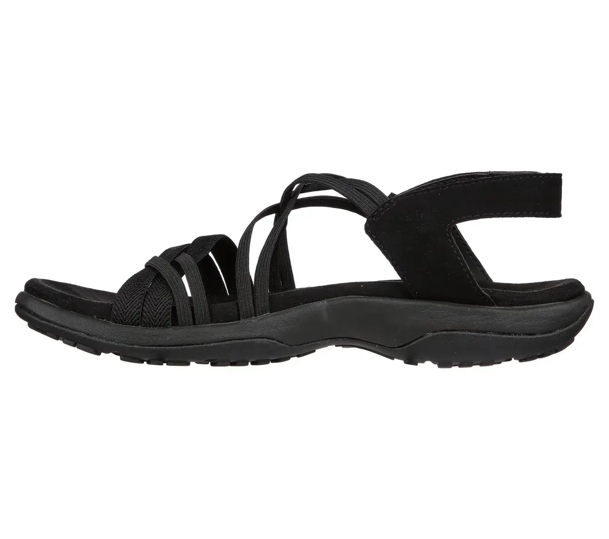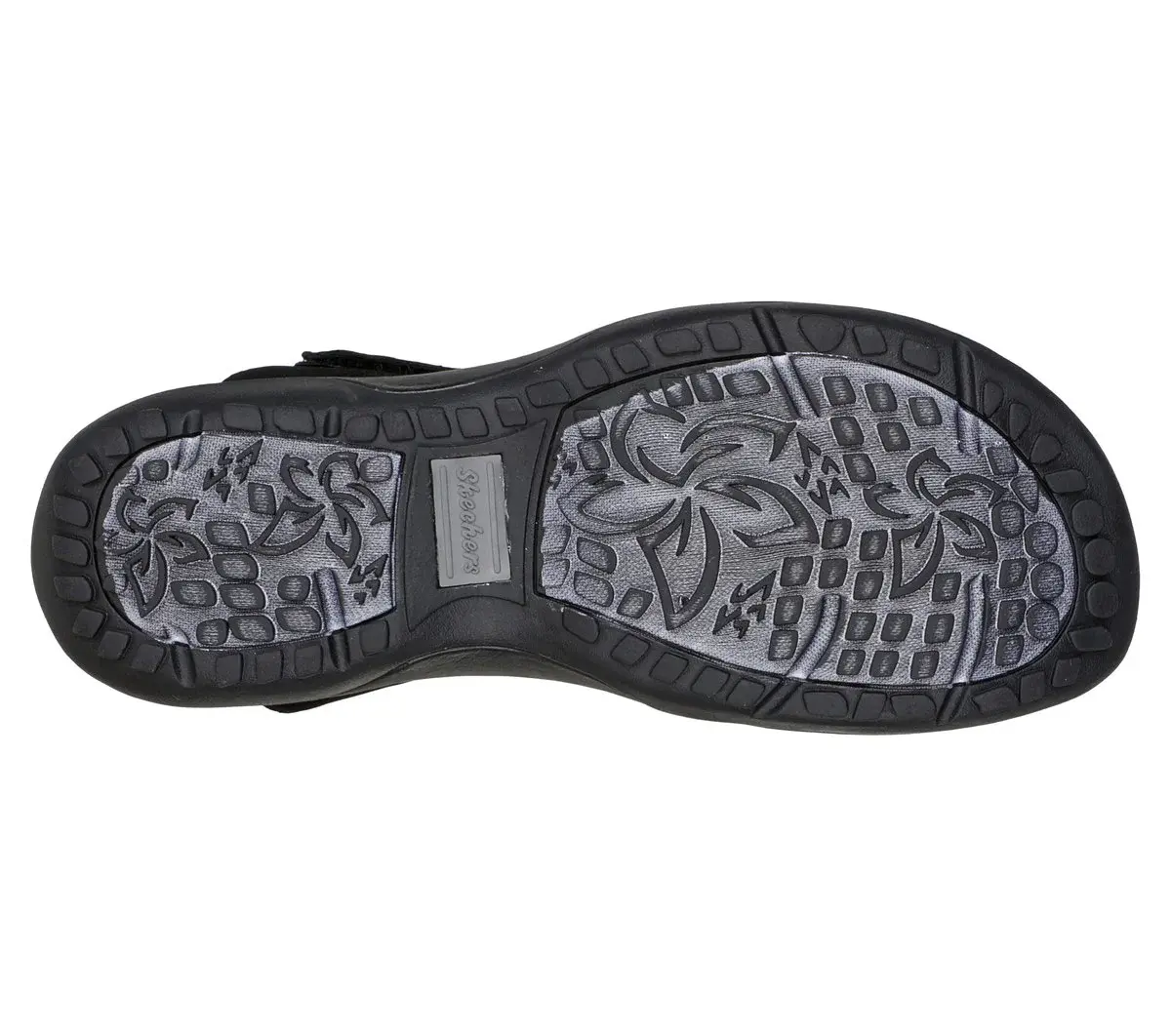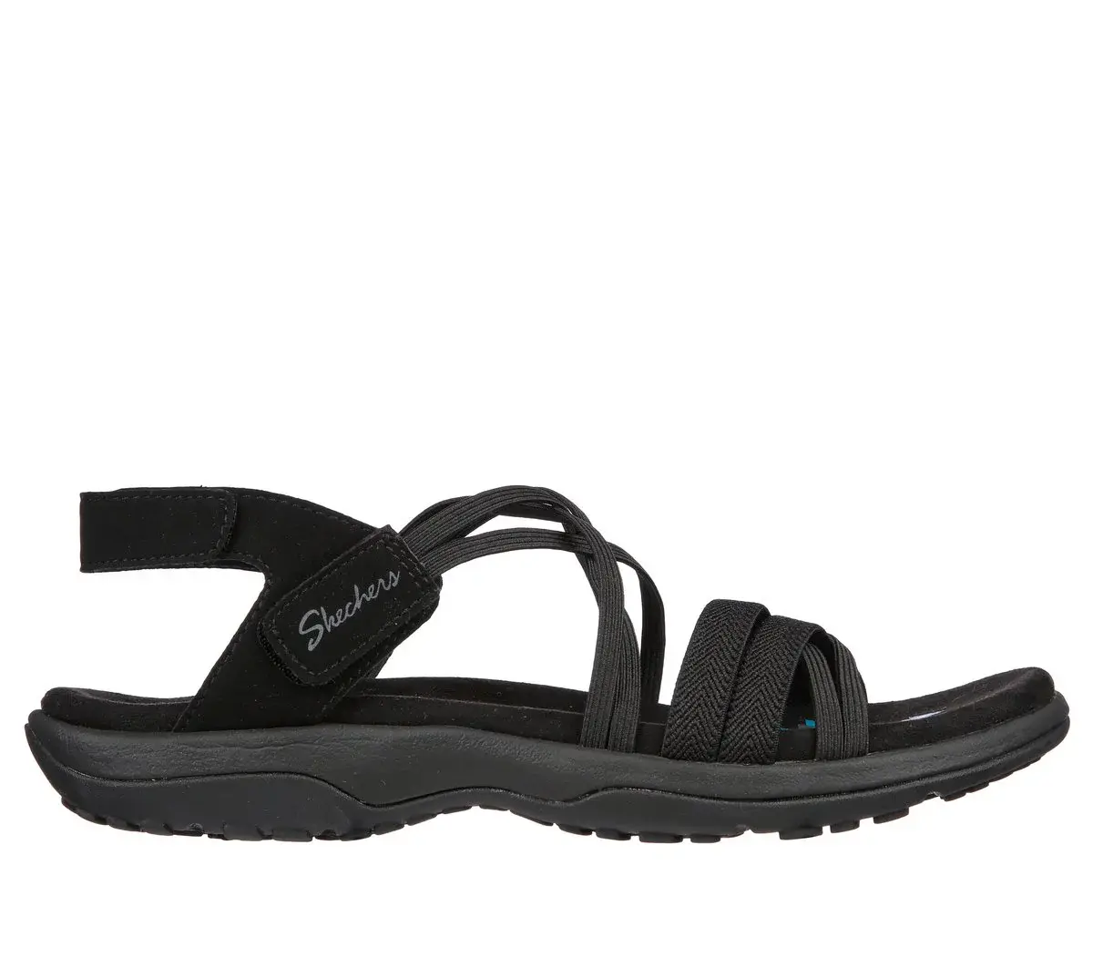 Make your style and comfort out of sight with Skechers Reggae Slim – Takes Two. This sandal features a smooth synthetic leather and soft stretch fabric upper with an adjustable heel strap, and a cushioned Skechers Memory Foam™ footbed.