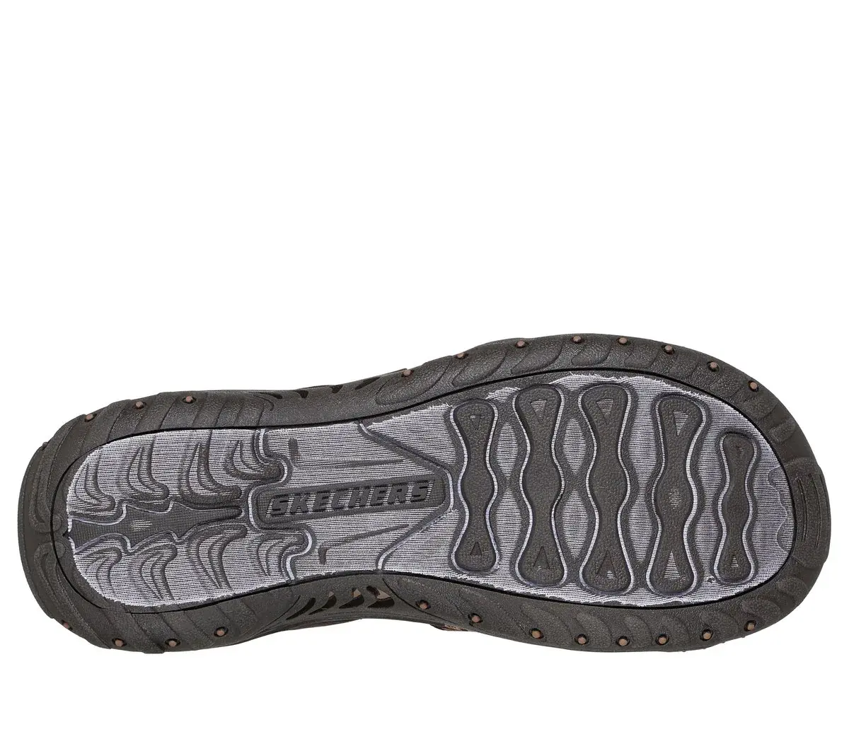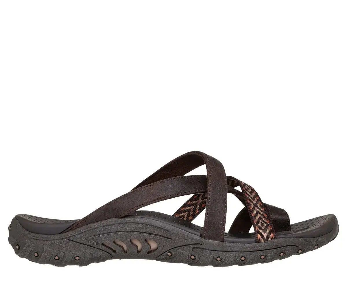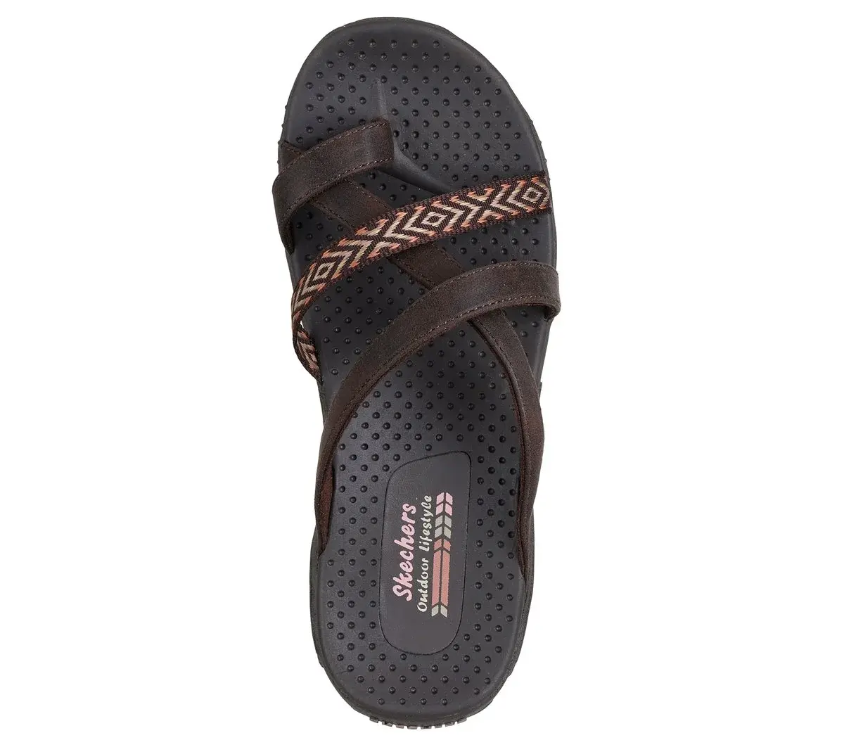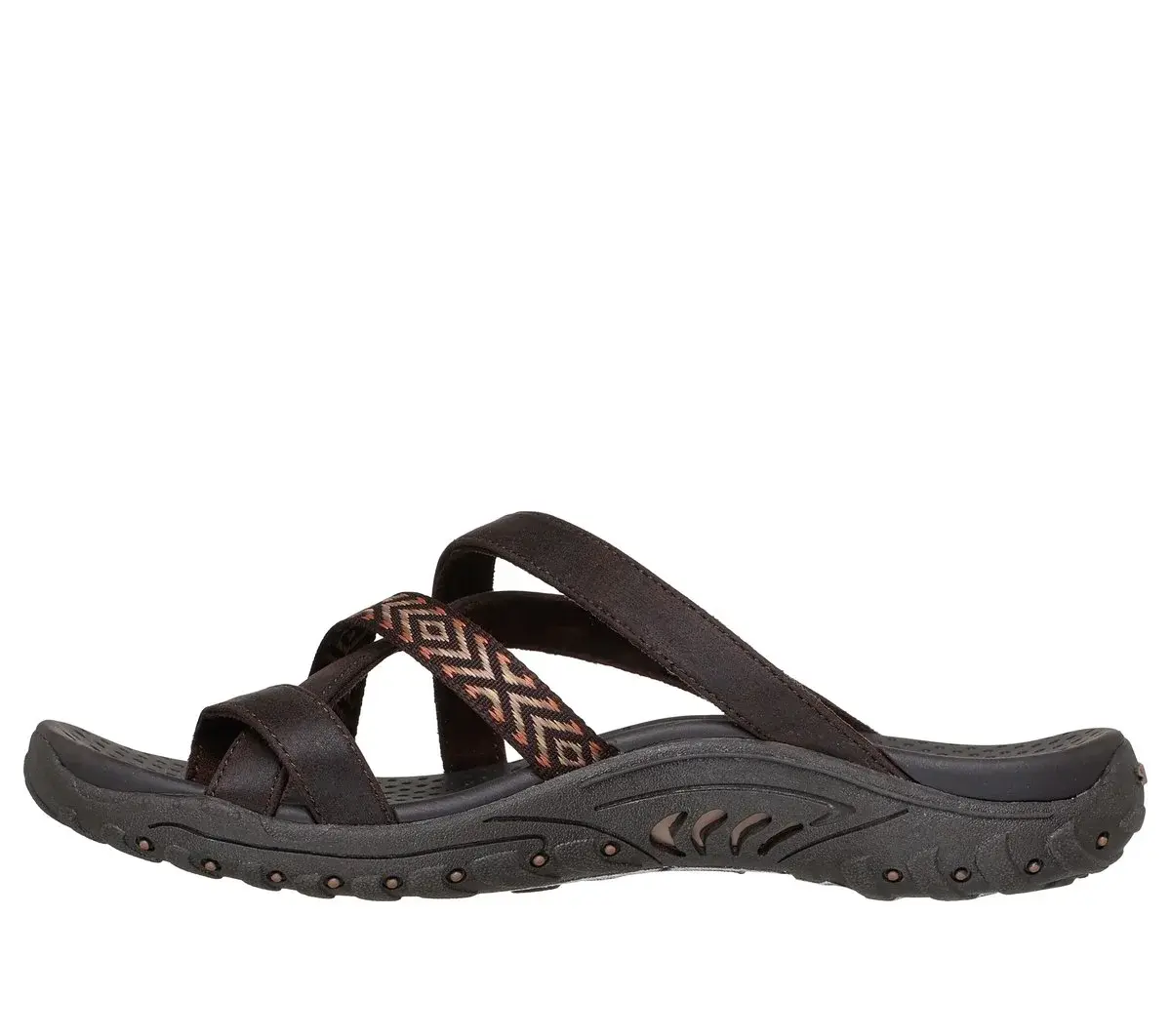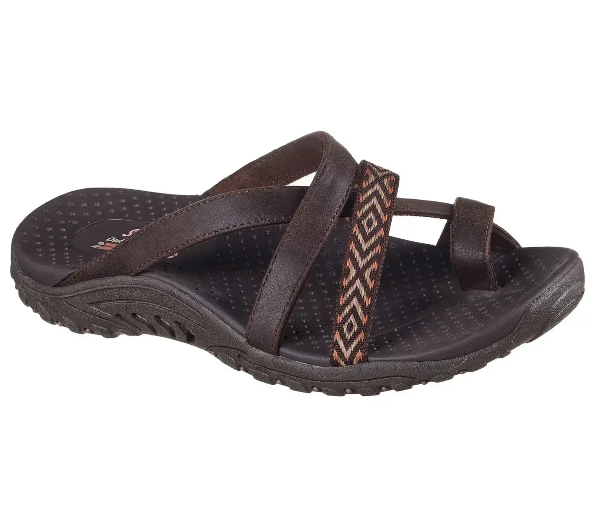 Comfort and breezy style makes a loving pair with Skechers Reggae – Timeless Summer. This outdoor trail toe loop sandal features a vegan leather and geo woven fabric upper, cushioned footbed, and a shock-absorbing Reggae midsole for added support.