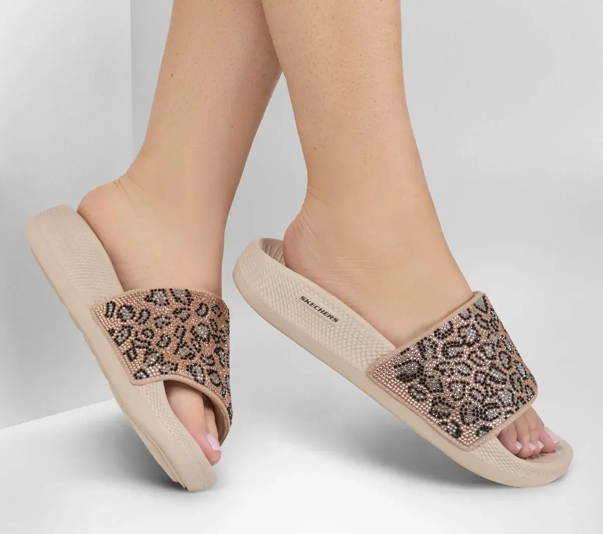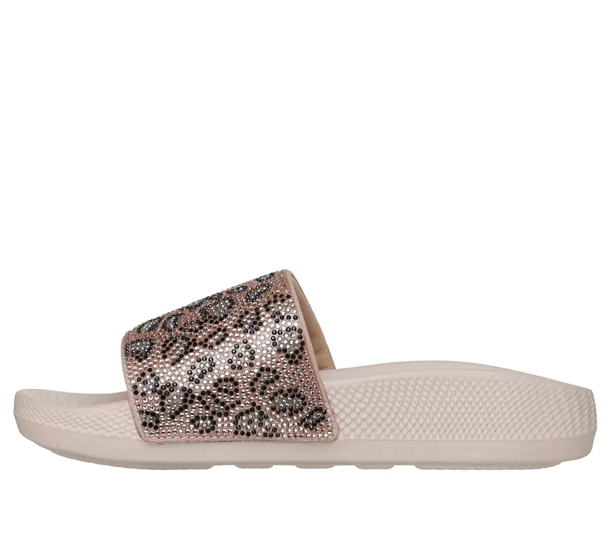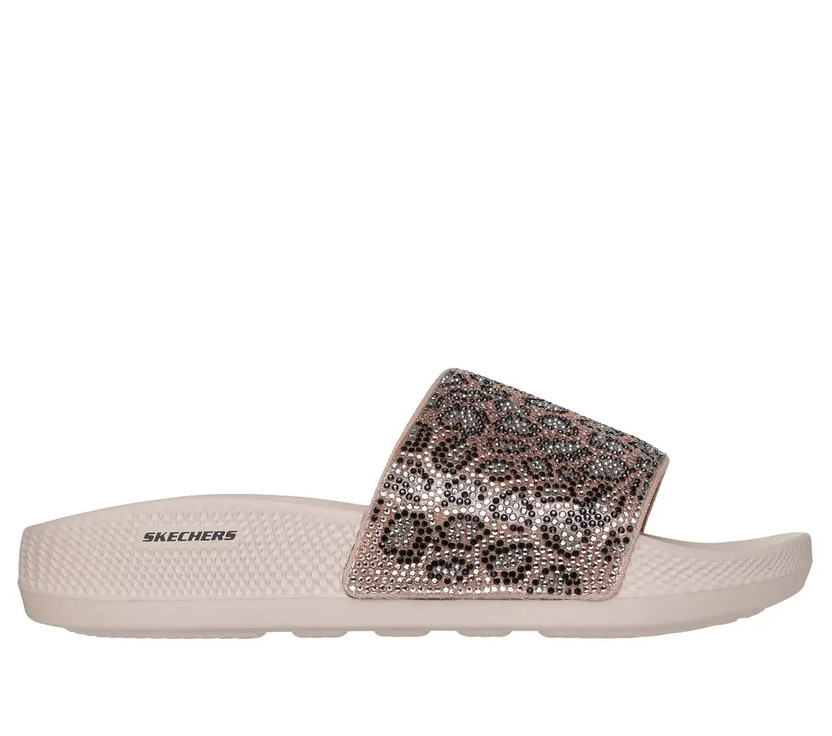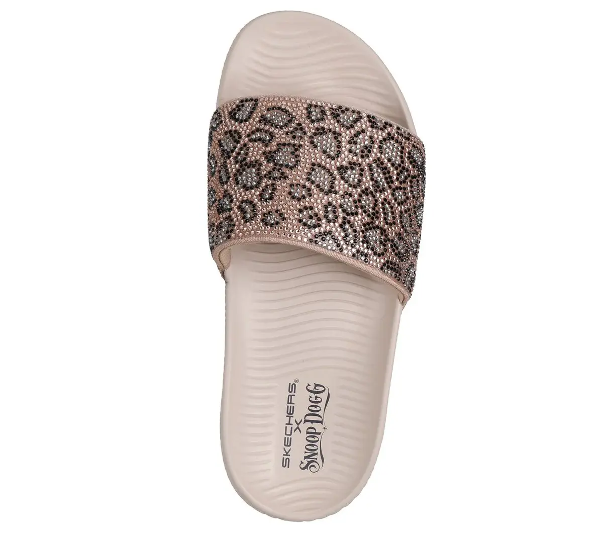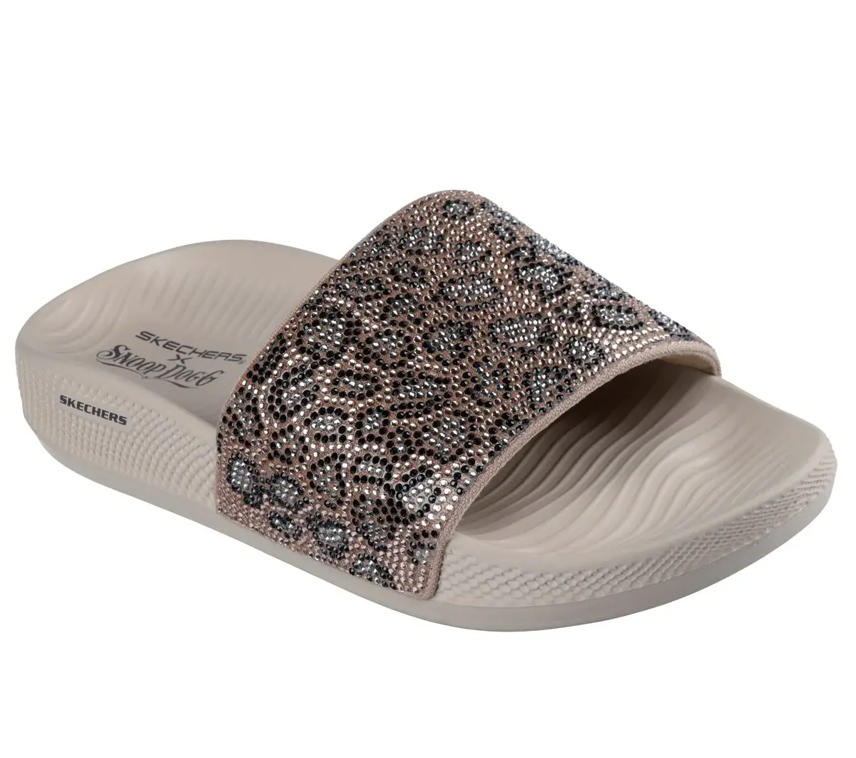 Snoopify your ‘slides-and-socks’ game in the blinged out Skechers x Snoop Dogg: Low Slider – Cheetalicious. Designed in three stand-out colorways, this single crossband slide features a rhinestone covered synthetic upper in a big cat pattern, plus a contoured Luxe Foam® cushioned footbed.
