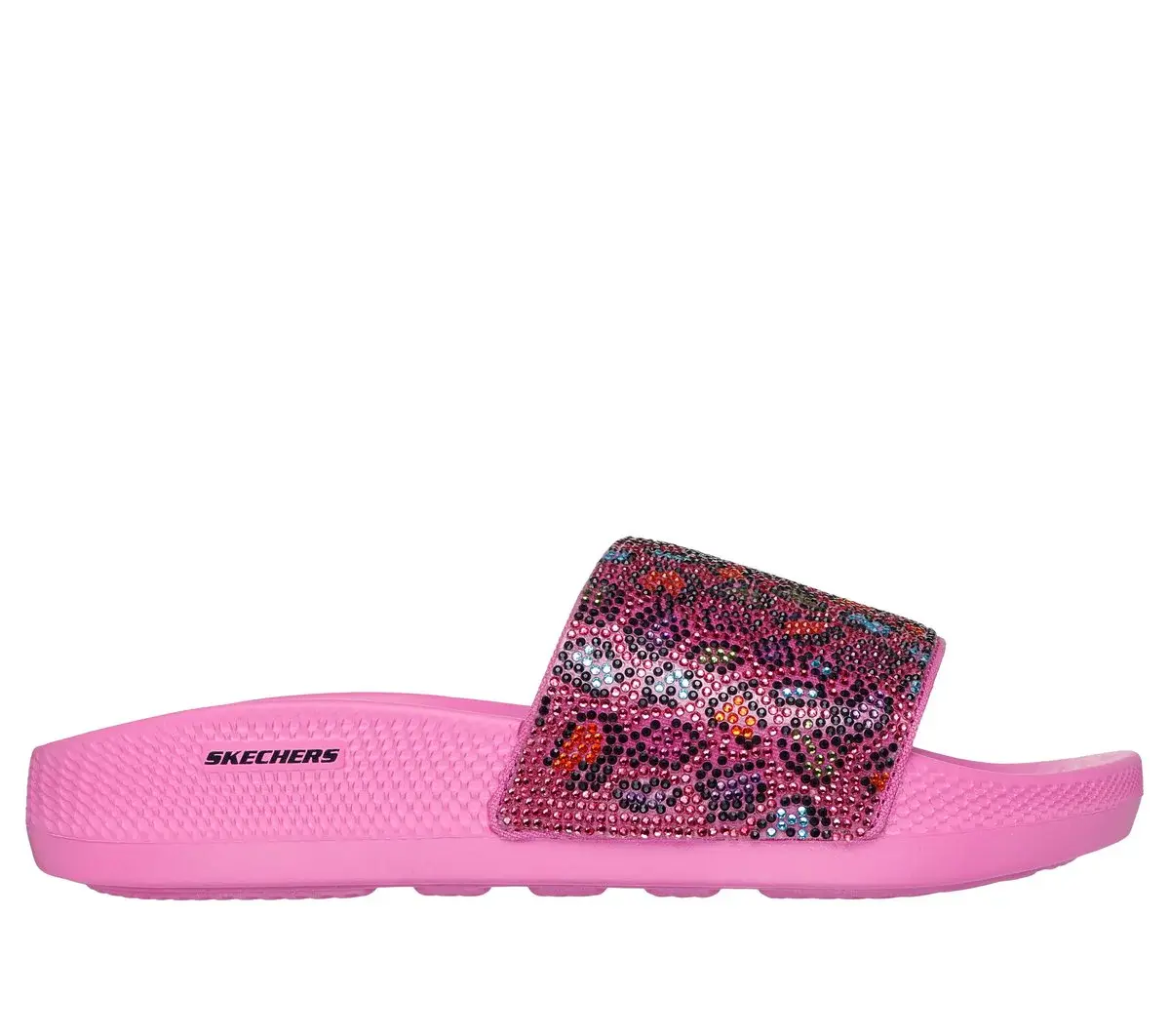 Snoopify your ‘slides-and-socks’ game in the blinged out Skechers x Snoop Dogg: Low Slider – Cheetalicious. Designed in three stand-out colorways, this single crossband slide features a rhinestone covered synthetic upper in a big cat pattern, plus a contoured Luxe Foam® cushioned footbed.
