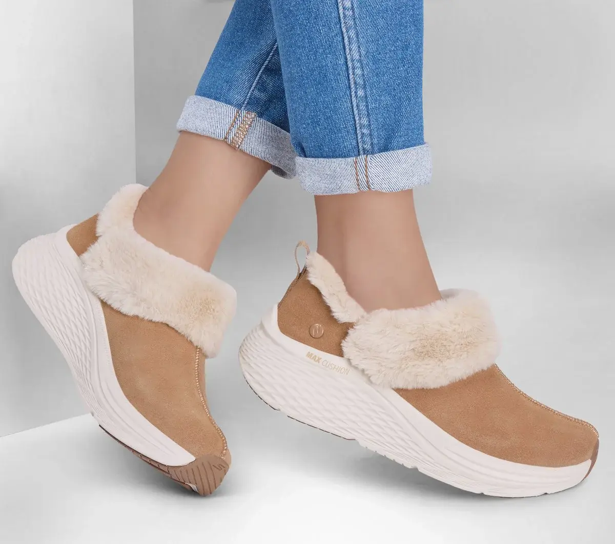 Elevate your style and comfort wearing Skechers Max Cushioning Elite™ 2.0 – Snowy Summit. This easy-on indoor/outdoor slipper design features a suede upper with faux-fur trim and lining, stitched top seam detail, lightweight ULTRA GO® cushioning, plus a Skechers Air-Cooled Goga Mat™ insole.