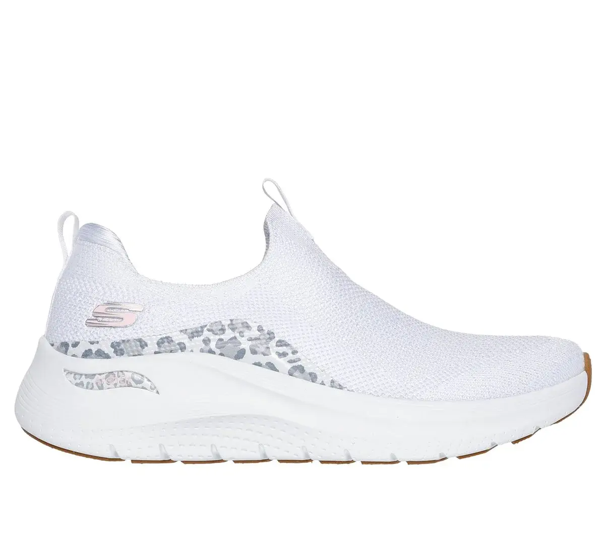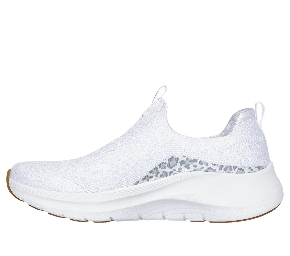 All-day comfort and support combine in Skechers Arch Fit® 2.0 – Wild Path. This laceless vegan design features a Stretch Fit® engineered knit upper with a leopard print trim and a removable Arch Fit® insole.