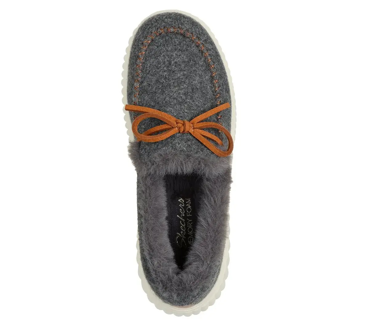 Delve into plush comfort all season long with Skechers Cozy Ojai. This moccasin inspired style features a faux wool upper with a bow front, faux-fur lining, and a cushioned Skechers Memory Foam™ insole.